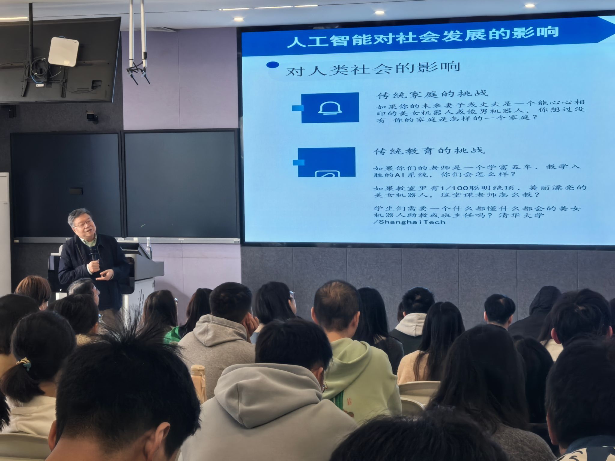 与会师生积极参与探讨,从人工智能对人类社会的影响、学术研究的延续性与创新性、研究技术与研究思想的对立统一性等视角展开了热烈的讨论,对人工智能快速发展为高等教育领域教育内容和方法创新、跨学科课程设计提供更广泛的可能性表现出极大的热情,学术交流氛围浓厚,探究内容广泛深刻。