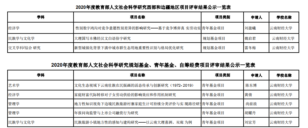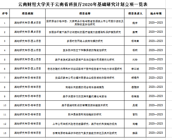 接《教育部社科司关于2020年度教育部人文社会科学研究一般项目评审结果的公示》和《云南省科技厅关于2020年省基础研究计划拟立项项目的公示》,beat365共有21个项目获得立项资助。其中教育部人文社会科学研究一般项目立项8项:规划基金项目2项、青年基金项目6项;云南省科技厅基础研究计划立项13项:重点项目2项、面上项目4项、青年项目7项。