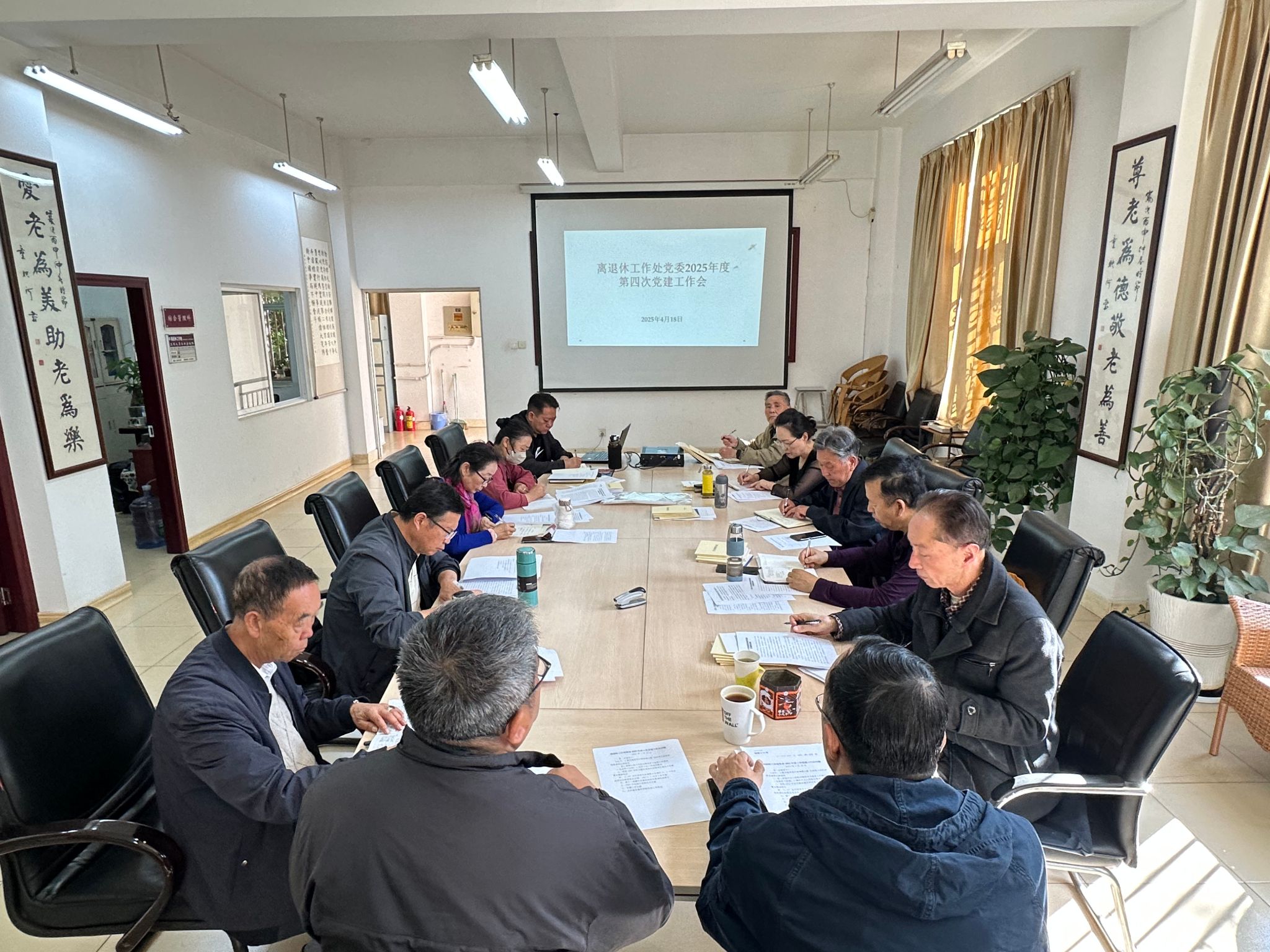 为认真贯彻落实上级及学校党委决策部署,全面推进“深入贯彻中央八项规定精神学习教育”,安排近期党建工作任务,2025年4月18日,离退休工作处党委在处会议室召开2025年度第4次党建工作会,处党委班子成员、支部书记、组织员参加会议。