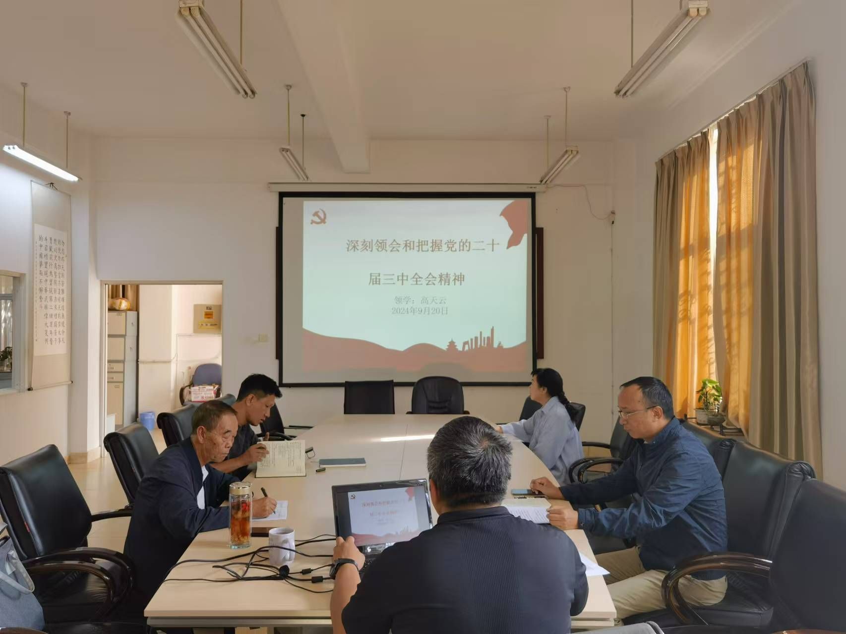 高天云以《深刻领会和把握党的二十届三中全会精神》为题进行领学,他从深刻领会和把握进一步全面深化改革的重大意义、指导思想、总目标、重大原则、重大举措及根本保证等六个方面深入阐述了全会围绕推进中国式现代化的主题,擘画出进一步全面深化改革的战略举措,体现了以习近平同志为核心的党中央坚持和完善中国特色社会主义制度、推进国家治理体系和治理能力现代化的历史主动,以进一步全面深化改革开辟中国式现代化广阔前景的坚强决心。他指出,我们必须把思想统一到党的二十届三中全会精神上来,把行动统一到党的二十届三中全会作出的重大决策部署上来,更加紧密地团结在以习近平同志为核心的党中央周围,高举改革开放旗帜,凝心聚力、奋发进取,为全面建成社会主义现代化强国、实现第二个百年奋斗目标,以中国式现代化全面推进中华民族伟大复兴而努力奋斗。