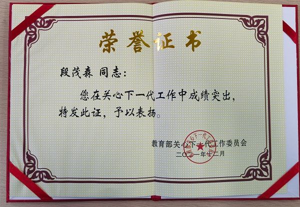 在2021年12月22日召开的教育部关工委第六次工作会议暨成立30周年纪念大会(视频会)上,beat365英国官方网站关心下一代工作委员会荣获全国教育系统关心下一代工作先进集体称号,退休老领导段茂森同志荣获全国教育系统关心下一代先进工作者称号。本次大会共表彰了491个先进集体,779名先进个人,127名突出贡献者。云南省有21个先进集体、20名先进个人受到表彰。