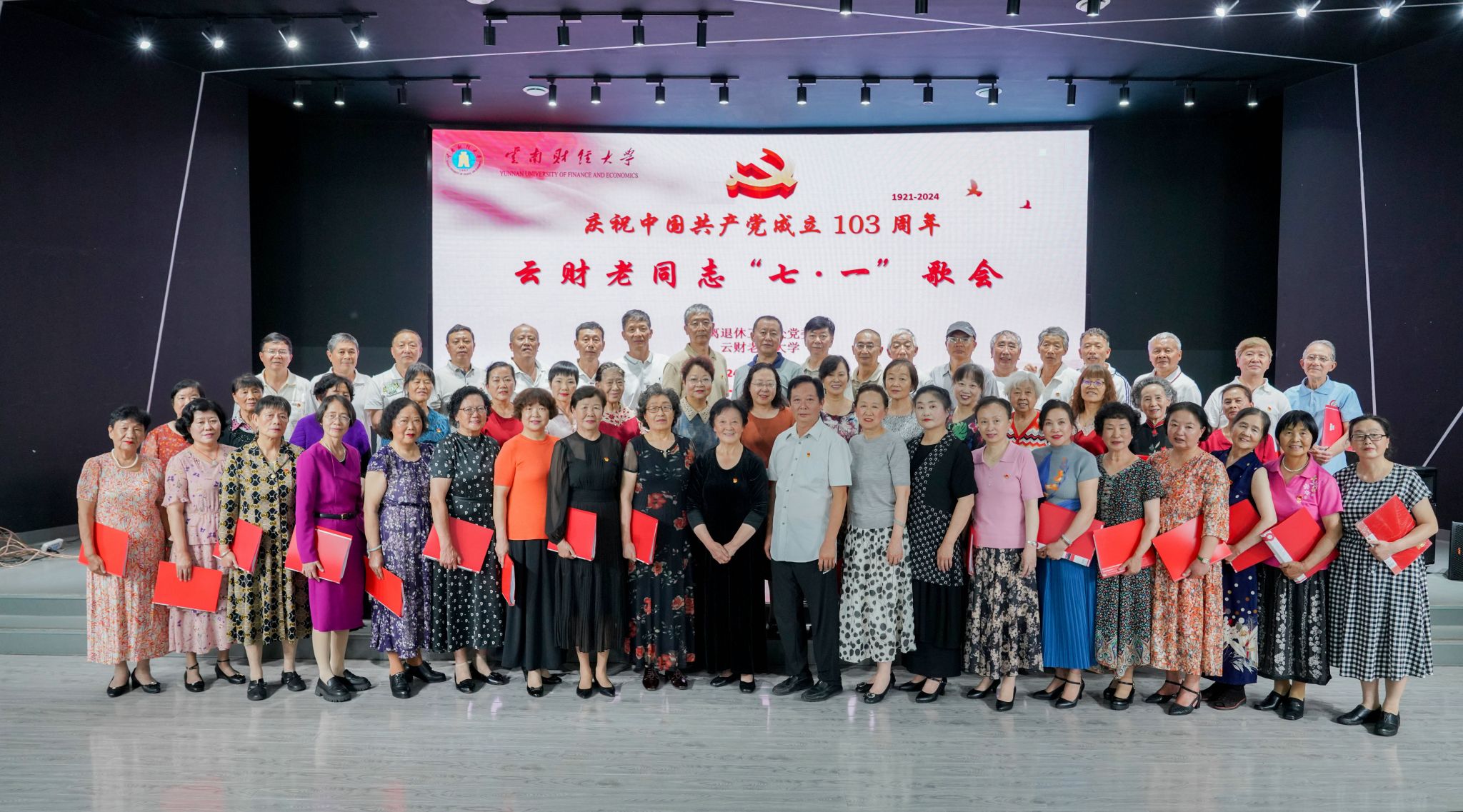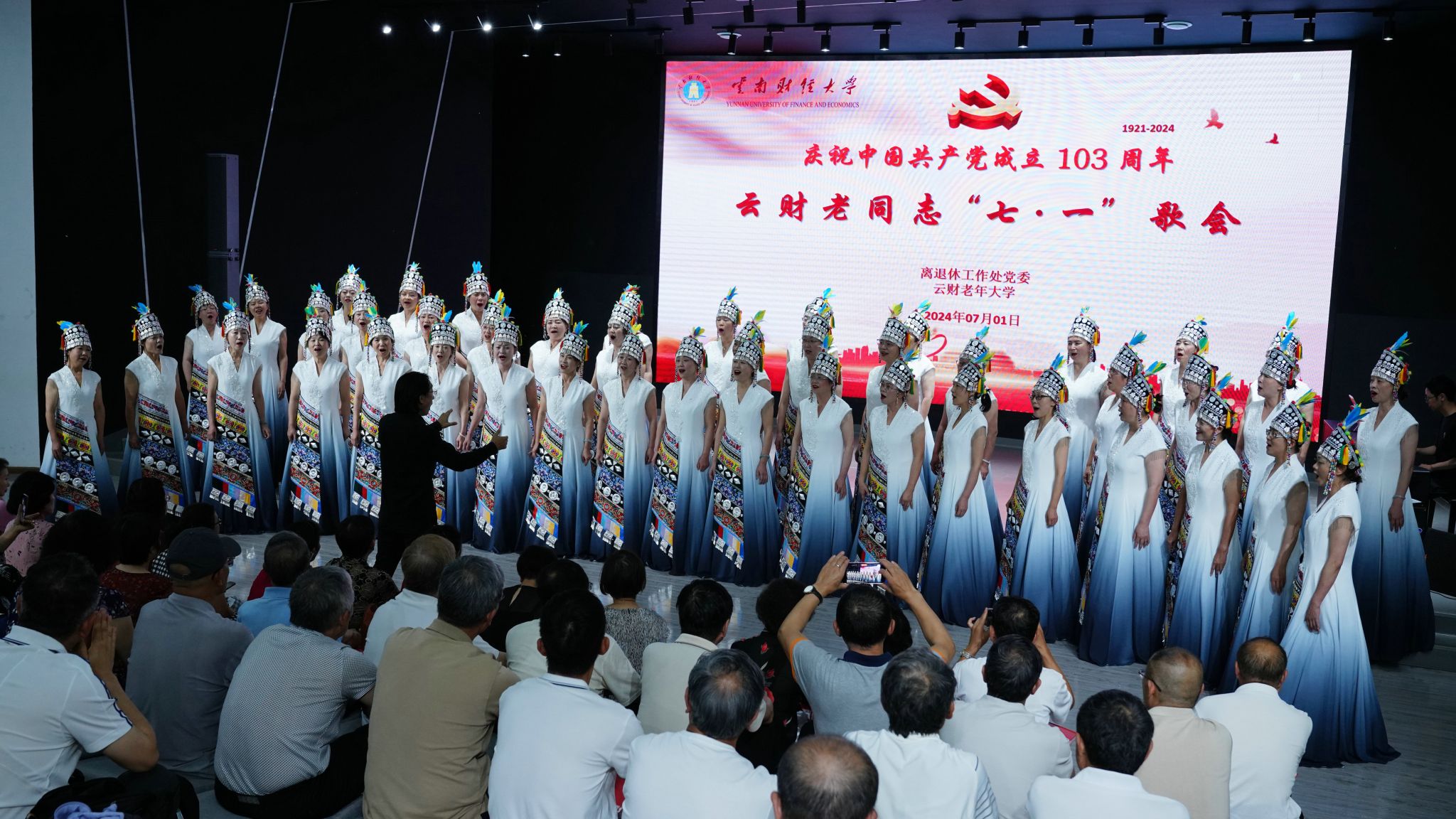 在中国共产党成立103周年之际,为进一步强化离退休党员政治引领,铸牢政治忠诚,坚定理想信念。 2024年7月1日,离退处党委与云财老年大学在北院路演大厅举办“庆祝党的生日”七•一歌会。离退处党委所属10个党支部近80余名老党员、云财老年大学声乐班全体学员参加活动,西南大学昆明校友合唱团应邀参加活动。活动由云财老年大学校长许坤泽主持,云财老年大学声乐班指导老师陈重舫担任指挥。