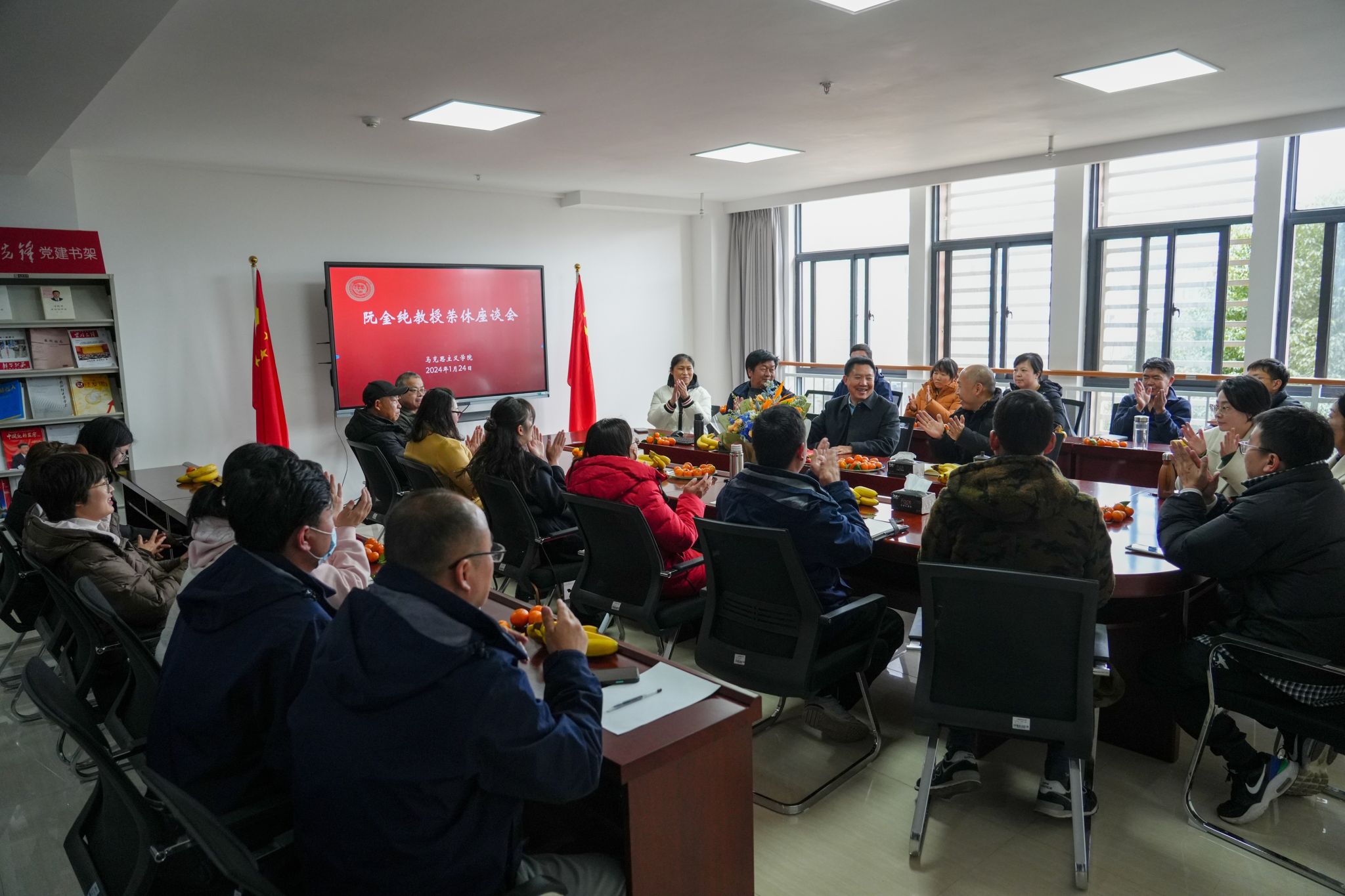 岁月沉淀桃李芳香,勤恳奉献薪火相传,1月24日,在这有着浓浓暖意的冬日下午,阮金纯教授荣休座谈会在马克思主义学院举行,学院教师们欢聚一堂,以最真挚的情谊祝贺阮老师光荣退休。学院院长宁乐锋代表学院致辞,座谈会由学院党委书记李亚军主持,学院教师代表共同见证了这一温馨感人的时刻。