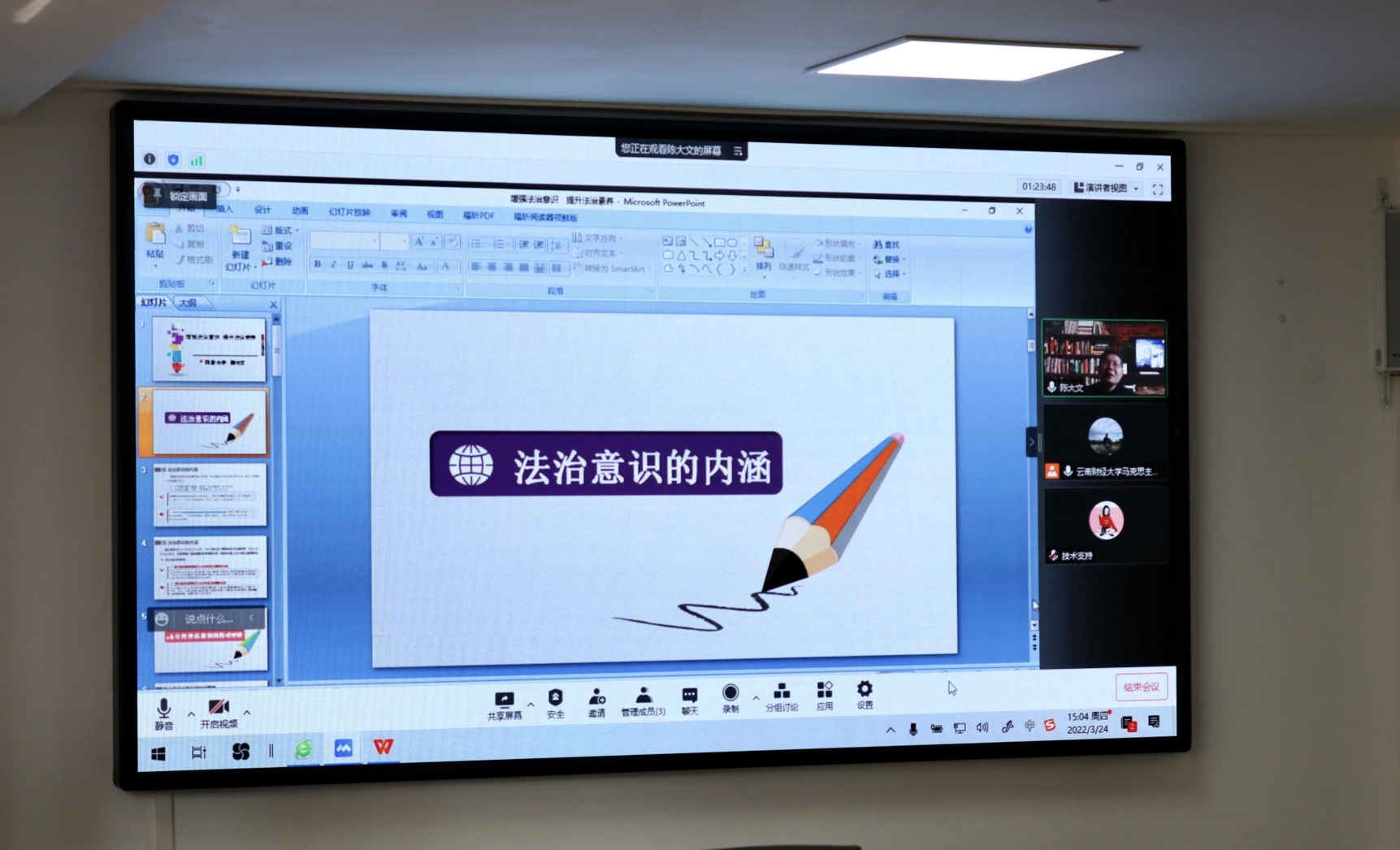 3月24日下午,2022年云南省高校“思想道德与法治”课集体备课会在beat365举行。国家教学名师、同济大学长聘教授、马克思主义学院博士生导师、教育部“思想道德与法治”分教学指导委员会副主任委员陈大文教授,受邀以线上形式为全省高校思政课教师作《增强法治意识 提升法治素养》专题辅导。马克思主义学院常务副院长宁乐锋教授主持。