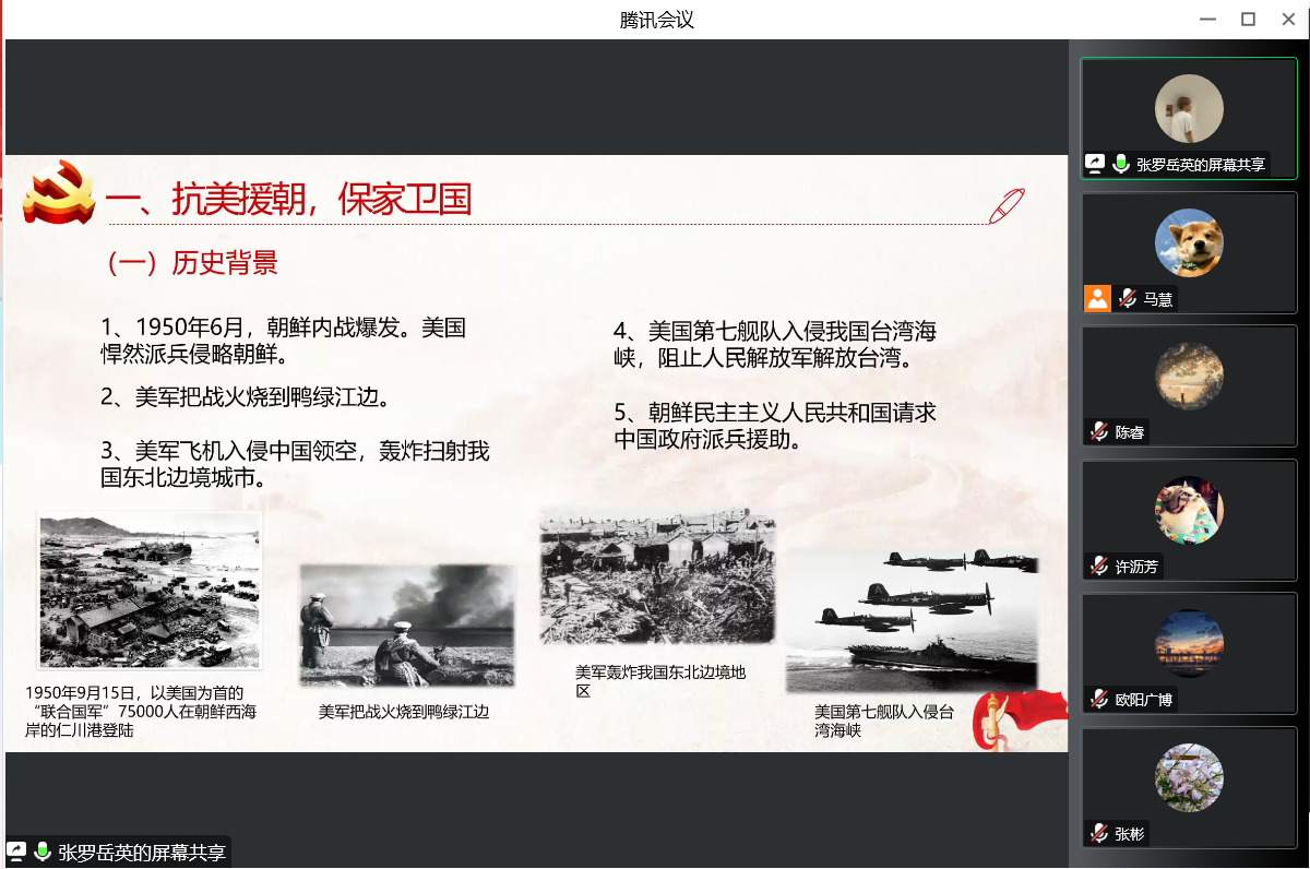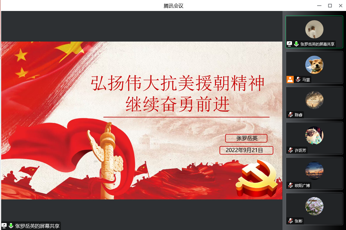 山河无恙,英雄归来。2022年9月16日,第九批在韩中国人民志愿军烈士遗骸交接仪式在韩国仁川国际机场举行。为铭记历史,致敬英雄,张罗岳英同志以“弘扬伟大抗美援朝精神 继续奋勇前进”为题,带领我们一起学习了历久弥坚的抗美援朝精神,激发了党员同志勇毅前行的强大精神力量。