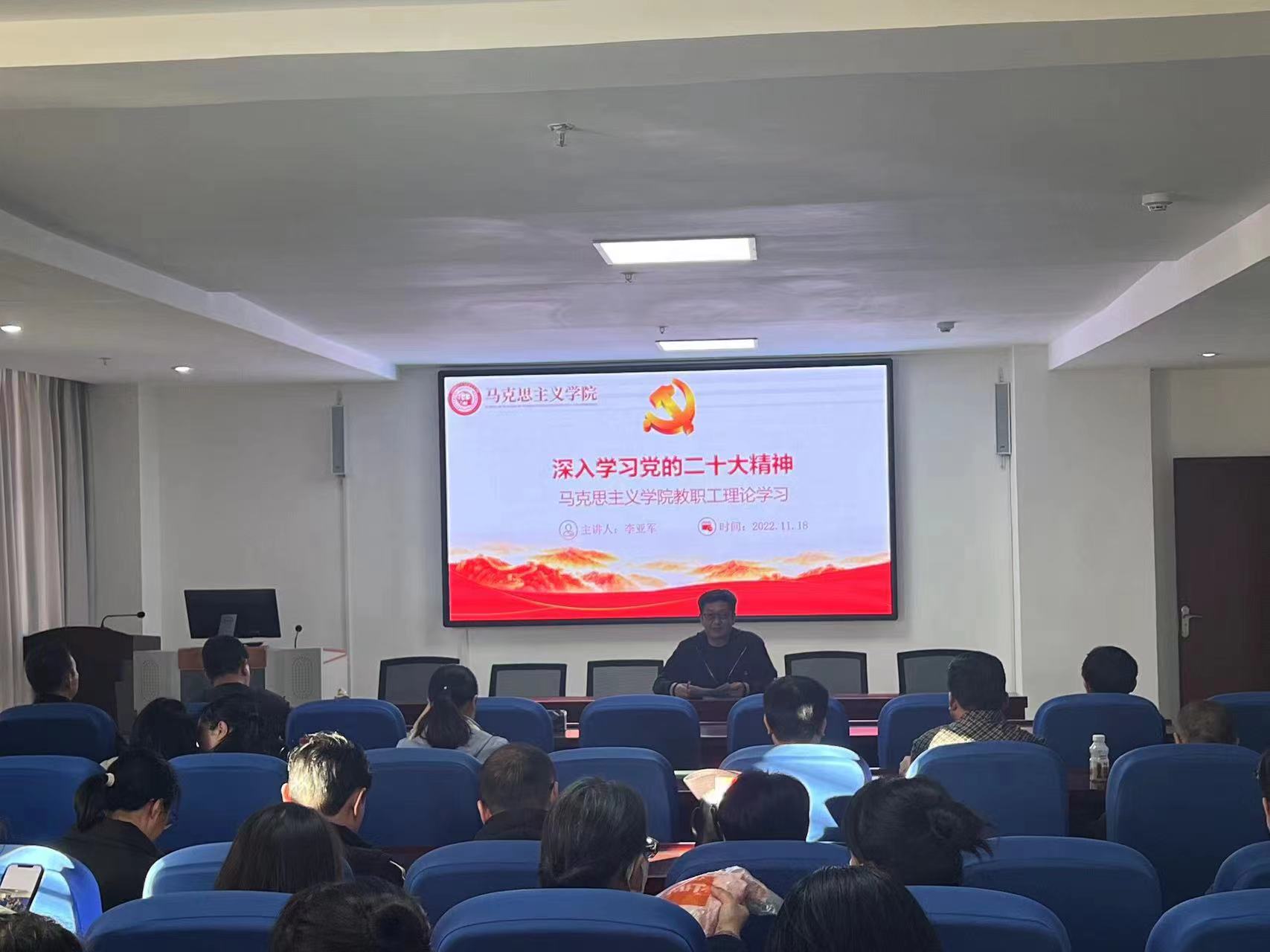 11月18日下午,马克思主义学院召开教职工理论学习大会,组织全院教职工深入学习党的二十大精神,会议由学院党委书记李亚军主持并领学。