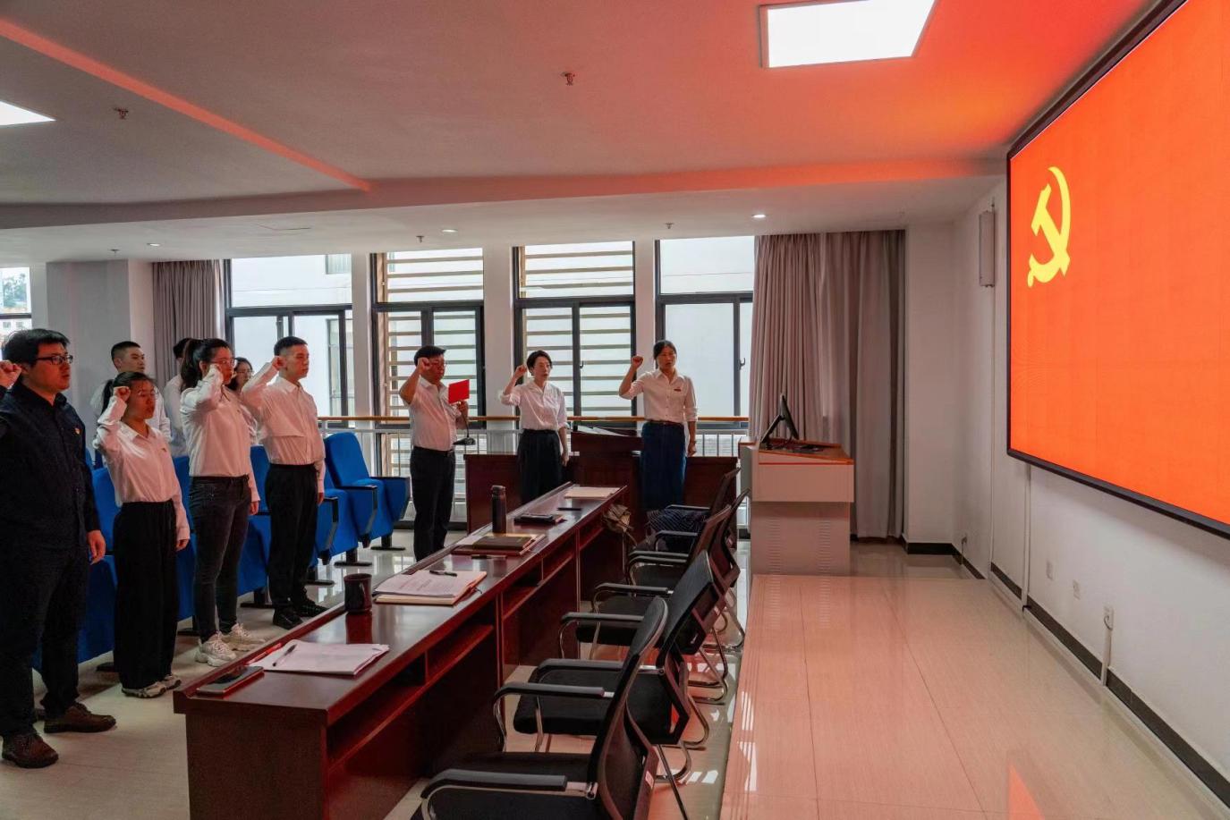 在庄严的中国共产党党旗下,马克思主义学院党委书记李亚军同志领誓,举行新党员入党宣誓仪式,老党员重温入党誓词。全体与会党员胸佩党徽,举起右拳,朗声宣读入党誓词, 铿锵有力的宣誓声表达出党员同志们为党的事业奋斗终身的坚定决心。
