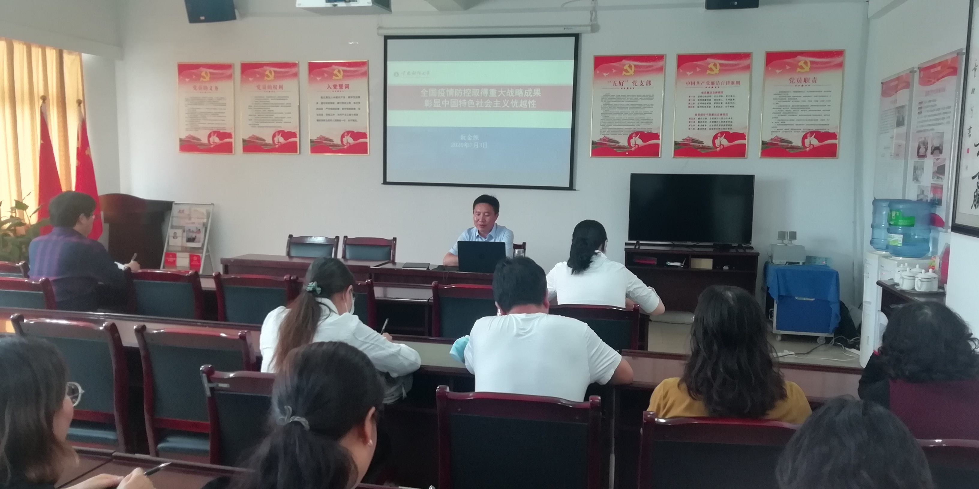 第三项内容为“党课开讲啦”专题党课。直属党支部委员、阮长阮金纯教授以《全国疫情防控取得重大战略成果 彰显中国特色社会主义优越性》为题 ,从中国“战疫”使中国制度优势得到检验、党对抗击疫情的集中统一领导显示制度的政治优势、全国范围内资源集中调度彰显“集中力量办大事”优势、面对疫情,全国人民在思想上精神上紧紧团结在一起,彰显文化优势等四个方面为大家带来一堂生动的专题党课。