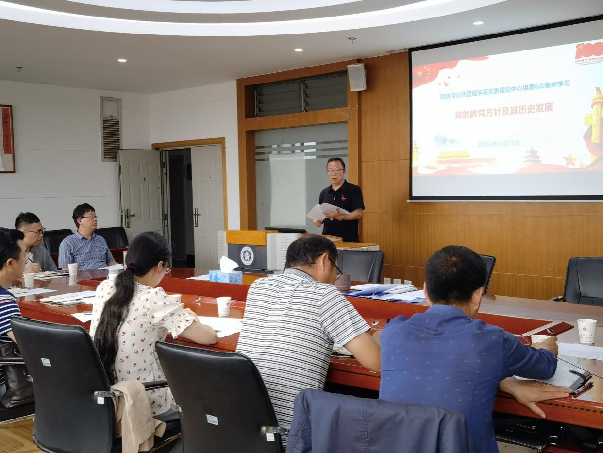 6月21日上午,财政与公共管理学院开展党委理论中心组扩大会第六次专题学习暨教职工理论专题学习,主题是深入学习领会党的教育方针与历史发展,学习活动由党委书记朱文领学,中心组成员、各科室负责人及各党支部书记参加了学习。
