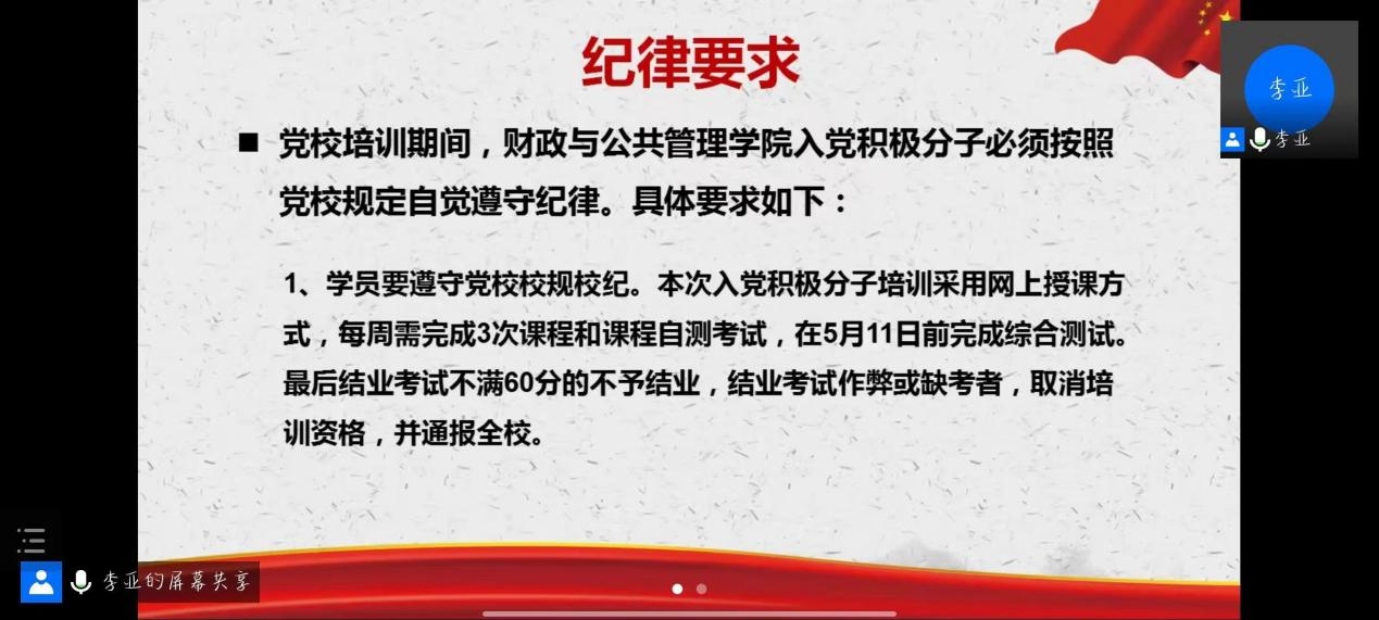 会上,李亚老师依次介绍了课程教学方式与计划、分组情况、考核方式和思想汇报要求,并严格向全体学员提出自觉遵守纪律、积极讨论、独立思考的要求,同时强调本次财政与公共管理学院第71期入党积极分子培训以线上学习为主,采取在线授课、小组讨论、学员自学和实践体验四种学习方式,通过小组互相检查的方式加强学员的积极性。