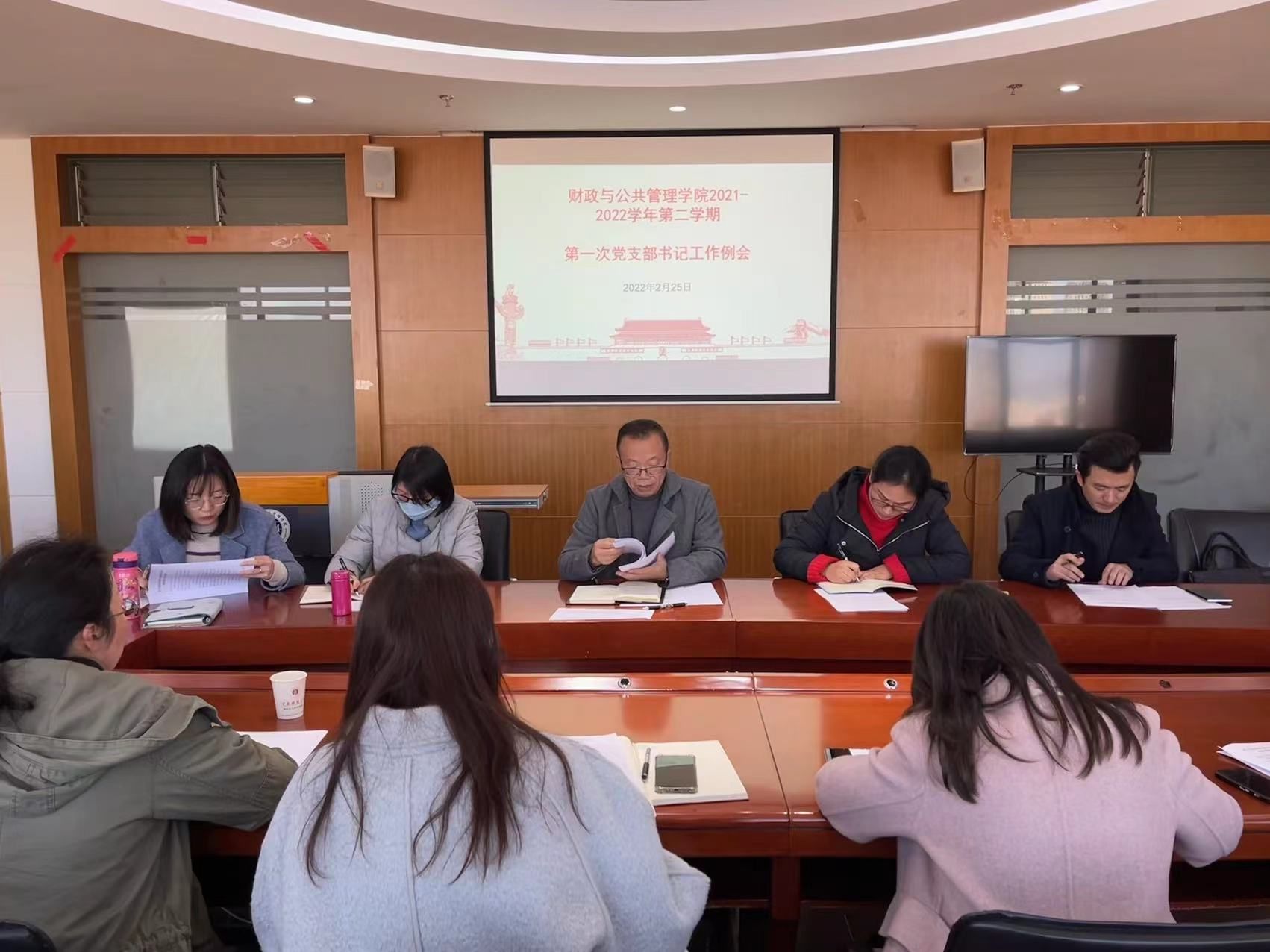 2022年2月25日星期五下午,财政与公共管理学院党委在逸夫楼923召开了党支部书记工作例会。学院党委副书记王晓芬、副处级组织员杨燕红、党委委员赵珺蓉、李树奇及各党支部书记参加了会议,会议由学院党委书记朱文主持。