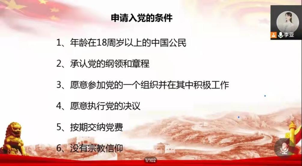 最后,李亚老师介绍了学院党支部的组成及支部书记,详细地讲解了年满18周岁的新生入党的相关程序,其中包括入党申请书的书写内容以及后期成为预备党员后的相关事项,解答了同学们的疑惑。李老师表示,思想上端正入党动机、坚定理想信念,行动上争做模范先锋,积极向党组织靠拢,以实际行动早日入党。