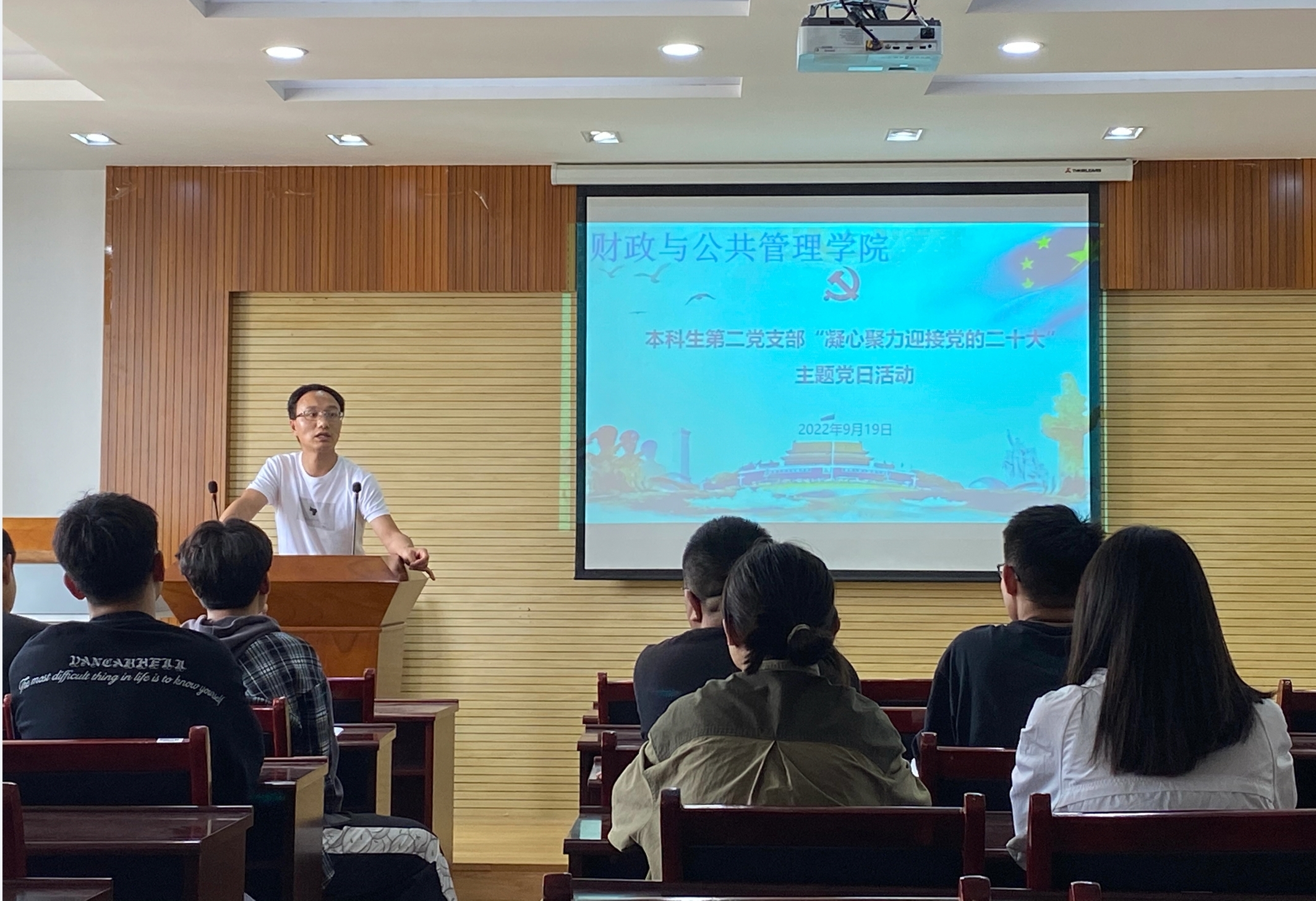 2022919日,财政与公共管理学院本科生第二党支部在逸夫楼603会议室召开九月份主题党日活动,本次党日活动主题为“凝心聚力迎接党的二十大”,本次活动由党支部书记李宁同志主讲,本科生第二党支部同志积极参与学习。
