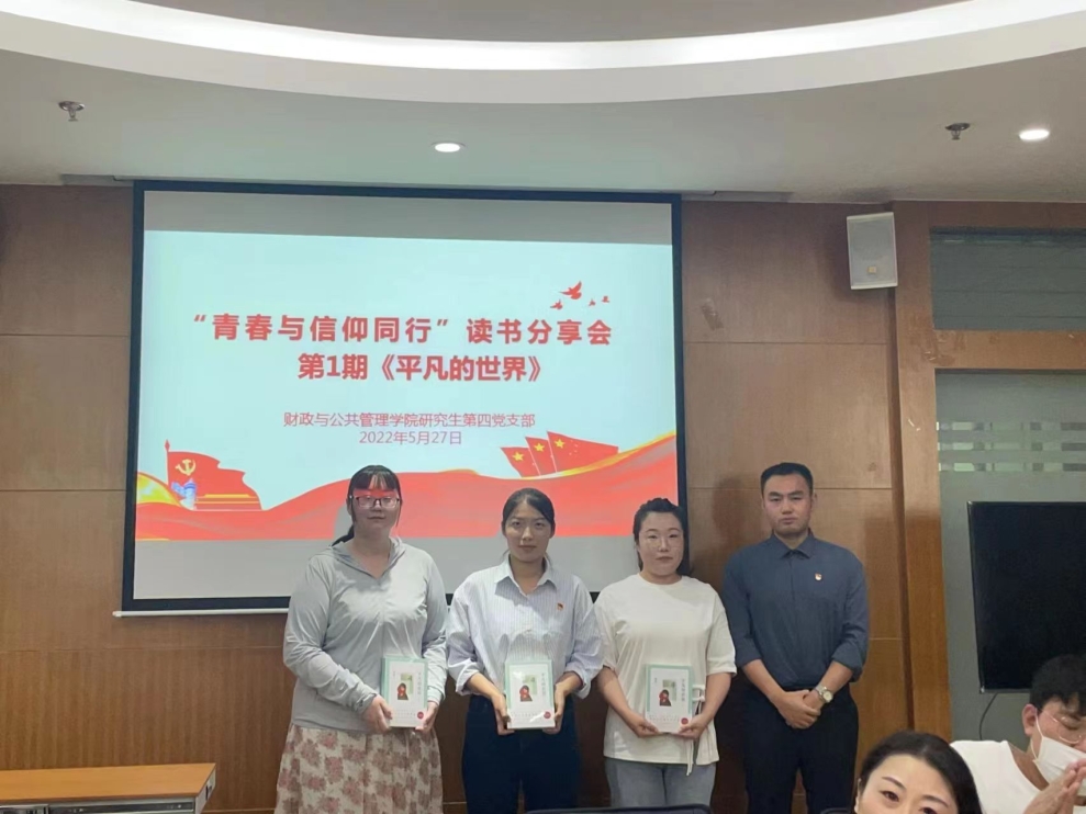 为了进一步加强支部文化建设,引领广大党员、团员青年厚植爱党、爱国、爱人民的情怀,2022年5月27日下午4点,beat365英国官方网站财政与公共管理学院研究生第四党支部在逸夫楼923教室开展了第一期“青春与信仰同行”读书分享会线下交流活动,由党支部书记李昊哲主持。