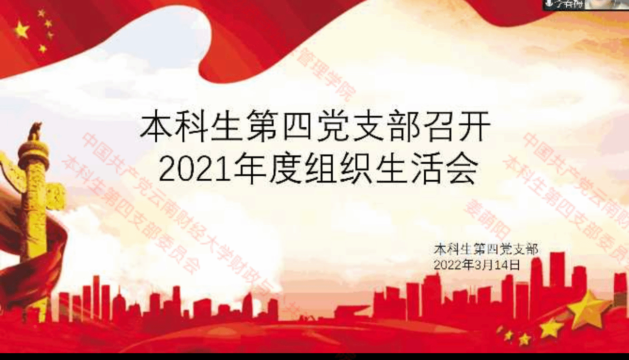 2022年3月14日晚上七点,财政与公共管理学院本科生第四党支部组织召开组织生活会。此次会议由党支部书记葛译遥老师主持,党委委员李树奇同志到会指导。