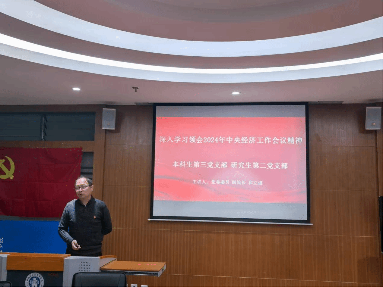 和立道首先以“深入学习领会2024年中央经济工作会议精神”为主题讲授专题党课。重点围绕五个统筹、总体要求和决策部署、2025年经济工作九项重点任务三个方面,深入分析2024年中央经济工作会议精神,要求全体党员认真学习领会2024年中央经济工作会议精神,把党中央的决策部署落实到今后的学习、科研中,提升专业素养,并积极向身边同学传递中国经济稳定发展的信心与力量。