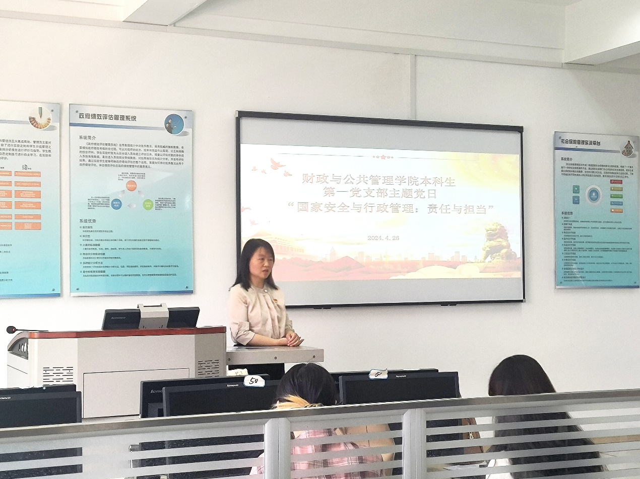 2024年4月26日,财政与公共管理学院本科生第一党支部在行知楼南303教室开展“国家安全与行政管理:责任与担当”主题党日活动,此次活动由支部书记李亚主持,支部全体党员参加。该活动旨在增强党员的国家安全意识,培养责任与担当。