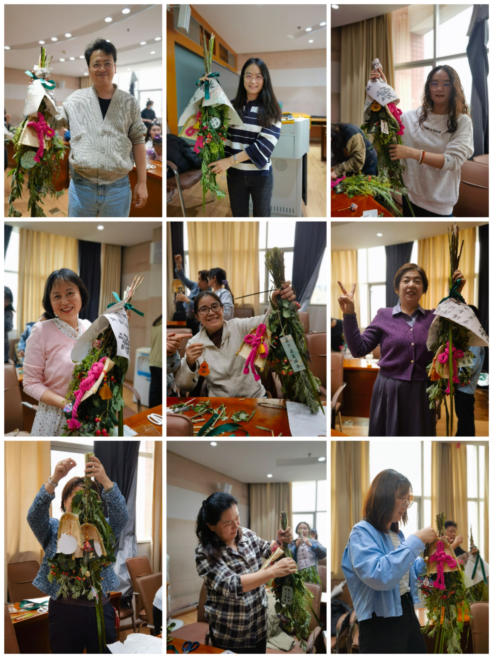 学院教职工共聚一堂,共同追溯端午民俗的起源,沉浸式感受中华传统节日与传统文化蕴含的独特魅力。在花艺师细致入微的讲解和耐心引导下,老师们将菖蒲、艾叶、艾蒿、女贞果、澳洲郁金香、红果、喷泉草等七种散发着馥郁清香、寓意着幸福祈福、象征着美好愿景的花材,巧妙且错落有致地组合在一起,再搭配上艾草香包、金色铃铛、福语卡片和中国结作为装饰,让整个插花作品更添节日氛围。