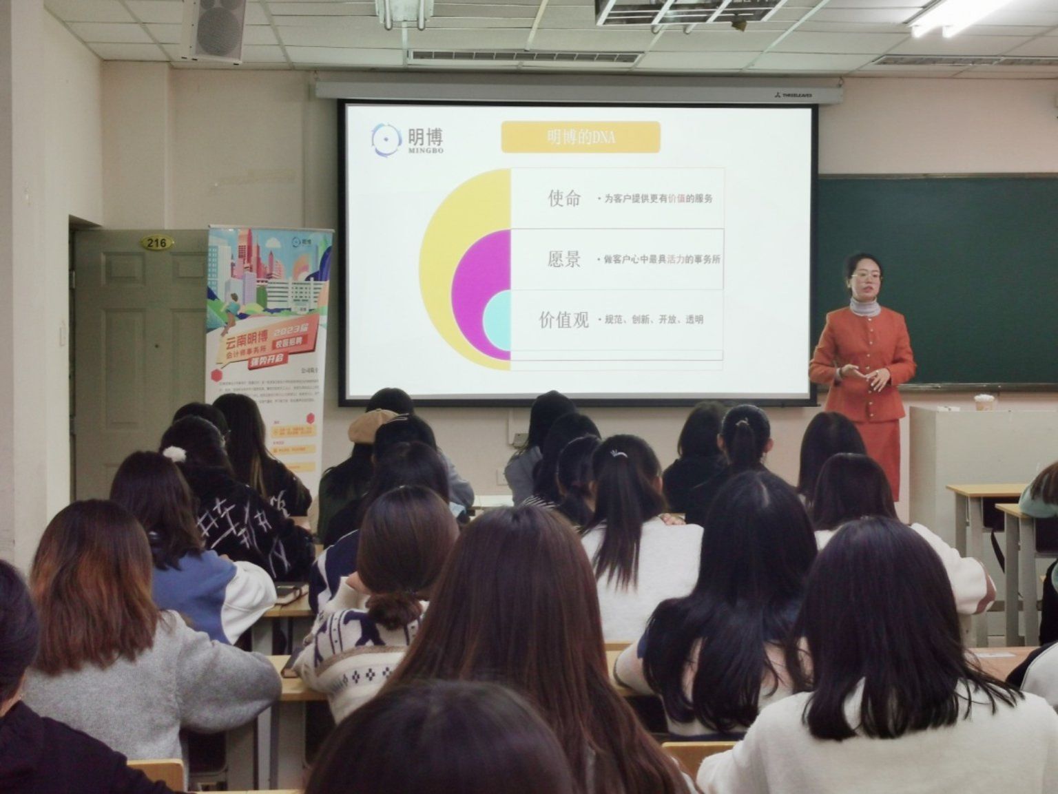 11月11日下午,财政与公共管理学院学生管理科团委北院卓远楼216教室举办云南明博会计师事务所专场宣讲会。云南明博会计师事务所副总经理王媛媛,运营助理、学院2021届毕业生刘怡媛,学院就业联络员毛丹及60余名毕业生参加了此次宣讲会。