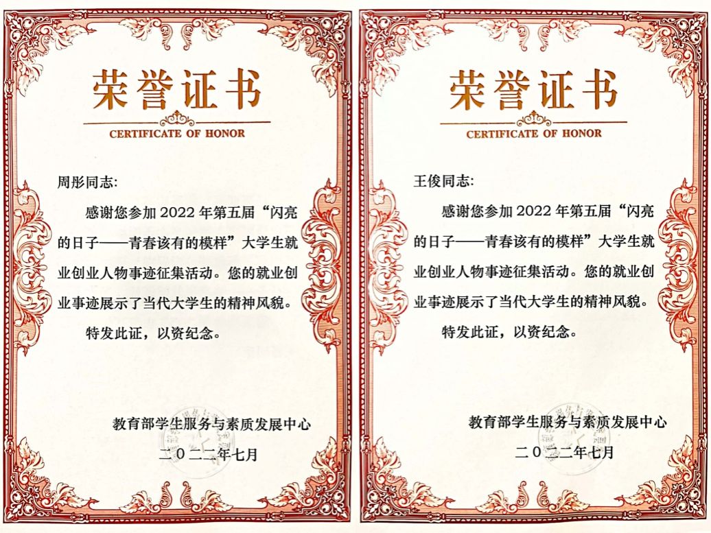 近日,财政与公共管理学院2021届毕业生周彤及2019级本科生王俊成功入选第五届“闪亮的日子——青春该有的模样”大学生就业创业人物事迹征集名单并获颁荣誉证书。