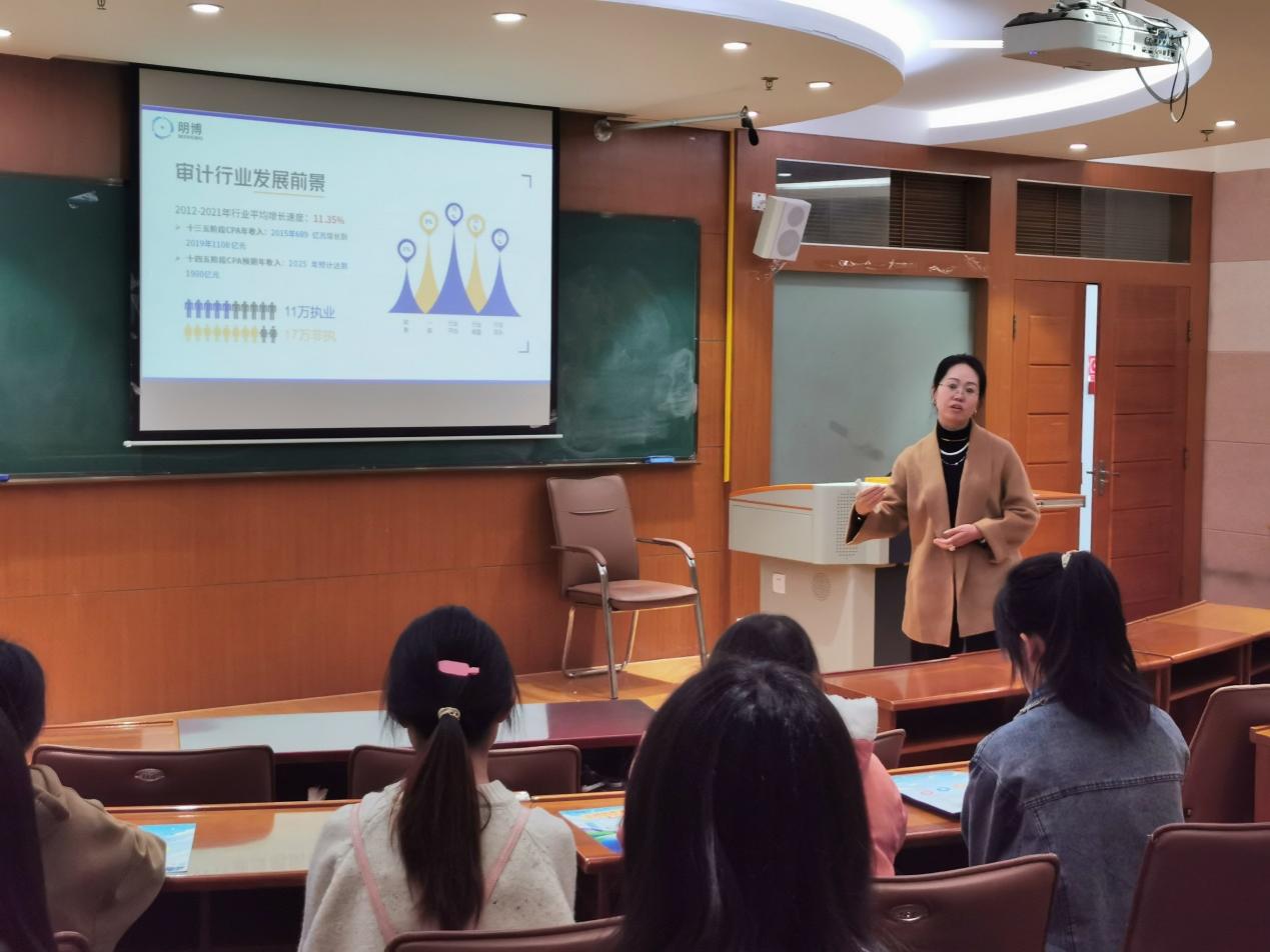 王媛媛从发展趋势、服务对象、职业前景等方面讲解了审计行业的特点,与同学们分享会计师事务所的工作日常与个人成长案例,并介绍了云南明博会计师事务所的发展历程、人才培养等方面内容。她表示,大学生在选择第一份工作时,要增强行业认知,提升格局视野,以韧性和毅力在行业扎根学习,才能有所收获。