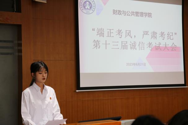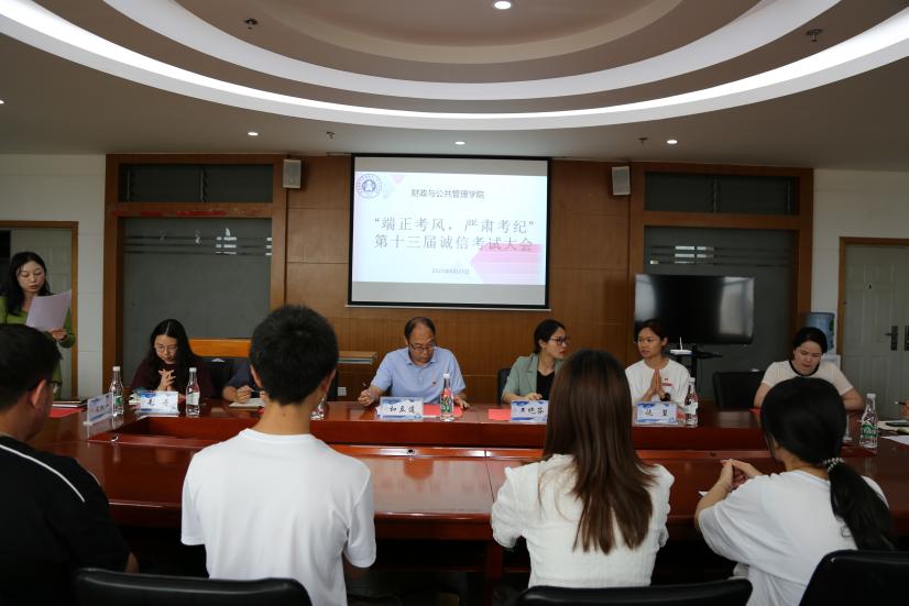 6月21日中午,财政与公共管理学院于南院逸夫楼923教室召开“端正考风,严肃考纪”第十三届诚信考试大会,财政与公共管理学院党委副书记王晓芬,副院长和立道,学生管理科科长饶篁,学院辅导员方素祥、杨德会、毛丹,组织员李昊哲,学生骨干、学生党员和各班学生代表参会,会议由学院辅导员王淑一主持。