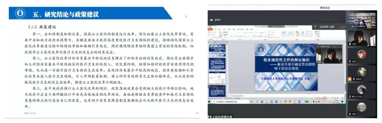 在论文汇报与评论环节,我院8位中青年教师分别围绕社会保障效应、公立医院综合改革、医疗卫生支出、结构性减税、财政制度改革、法治税收等主题以PPT形式汇报了论文,点评嘉宾从编辑和学科专业两个维度做出精彩点评,每篇论文的汇报、评审与互动时间均超过1小时。