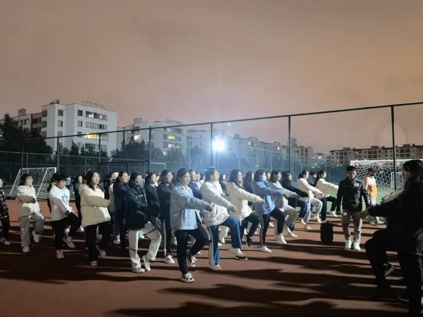 11月19日晚上8点,财政与公共管理学院党委副书记王晓芬与团委书记饶篁、辅导员王淑一老师来到训练场,为辛苦训练的同学们加油鼓劲。