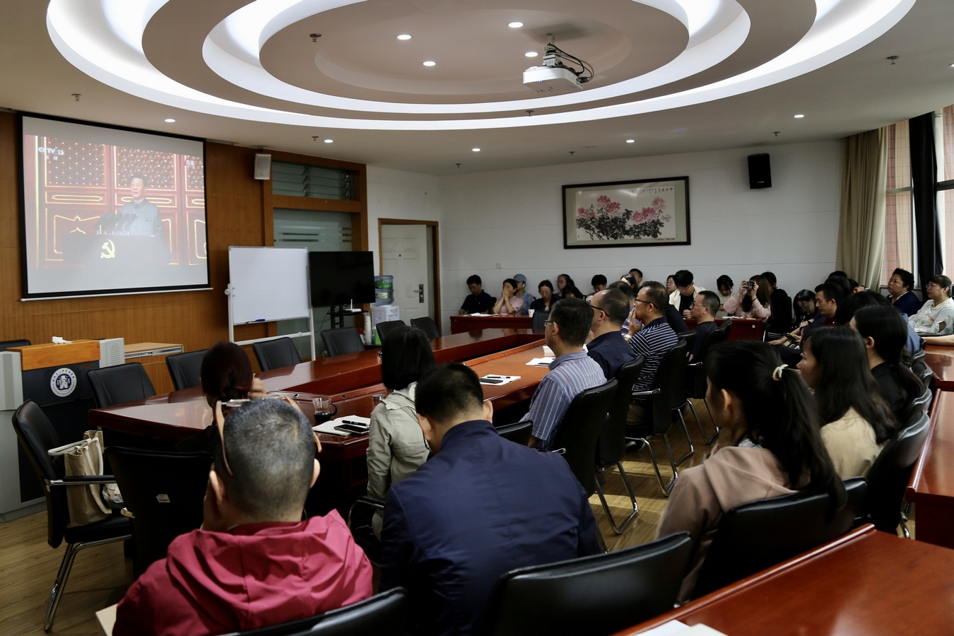 学院党政领导班子、党委委员,党支部书记、支部委员及部分师生党员、学生骨干在逸夫楼923集中收听收看庆祝中国共产党成立100周年大会实况直播。