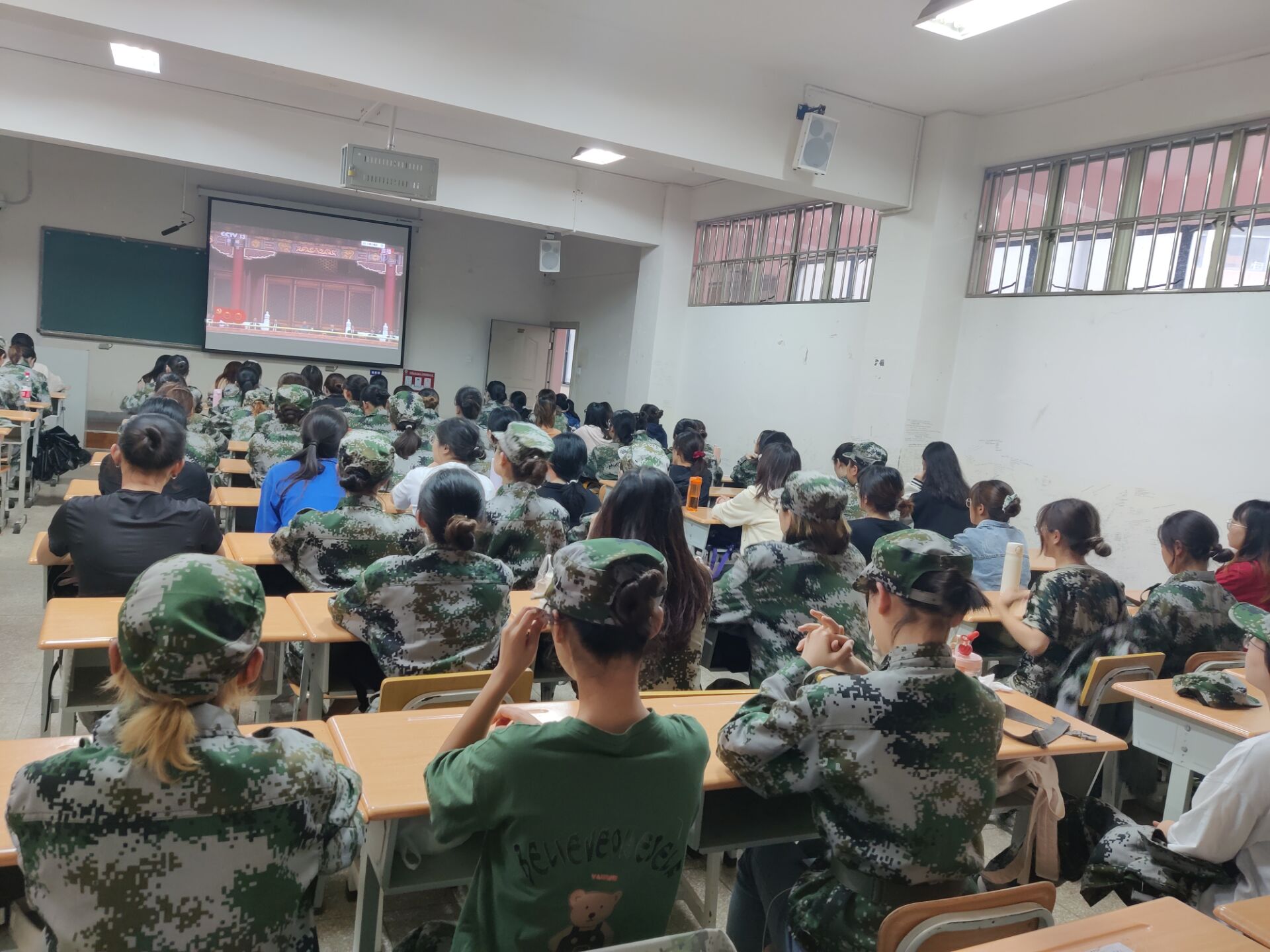 2019级全体参加军训同学以在教室集中收听收看庆祝中国共产党成立100周年大会实况直播。