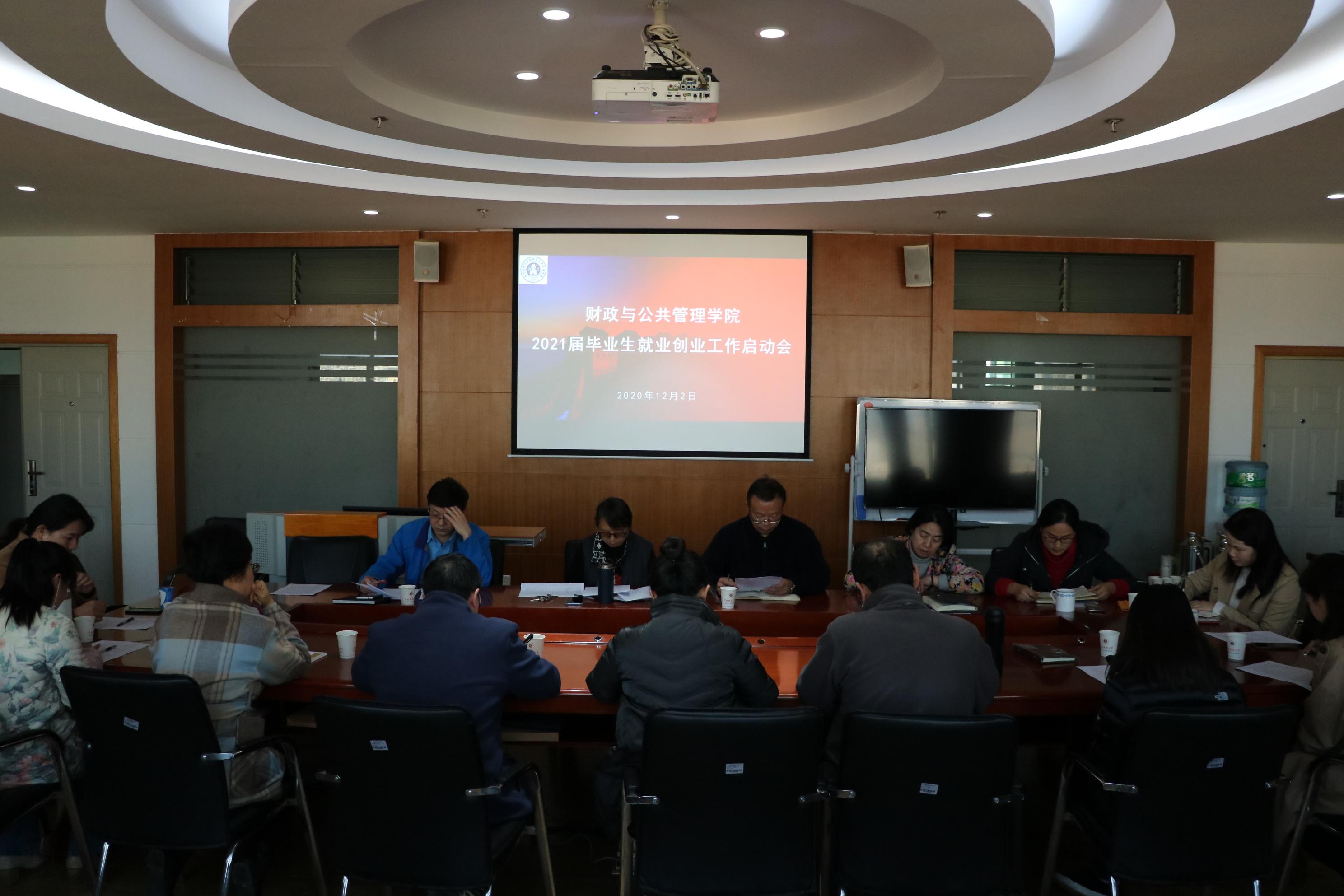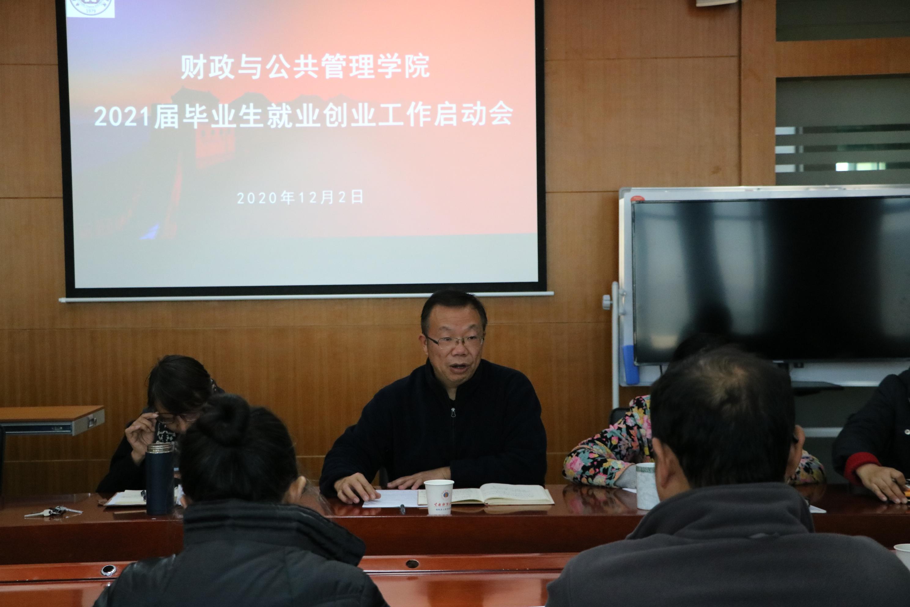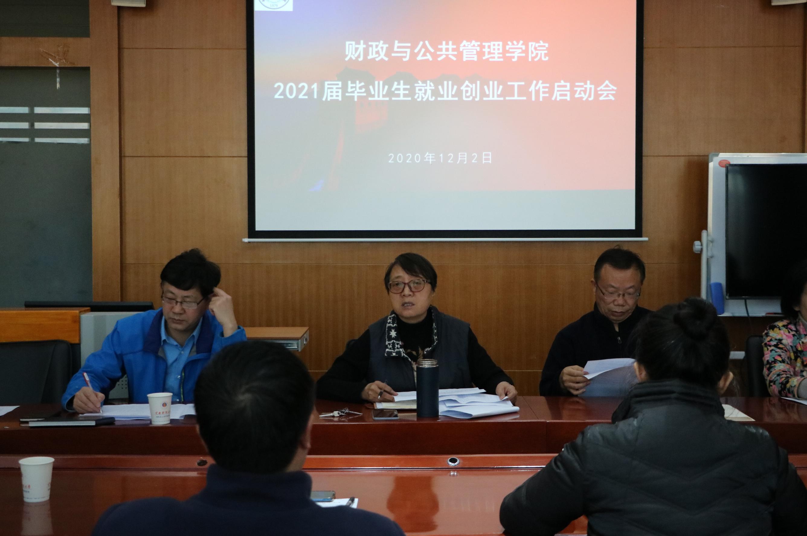 12月2日下午,财政与公共管理学院在逸夫楼923召开2021届毕业生就业创业工作启动会。院长李妍,学院党委书记朱文,学院党委副书记王晓芬,副院长韩全芳、马国芳,各教学系系主任,各科室负责人,辅导员及全体毕业班班主任参加了此次会议。会议由党委副书记王晓芬主持。