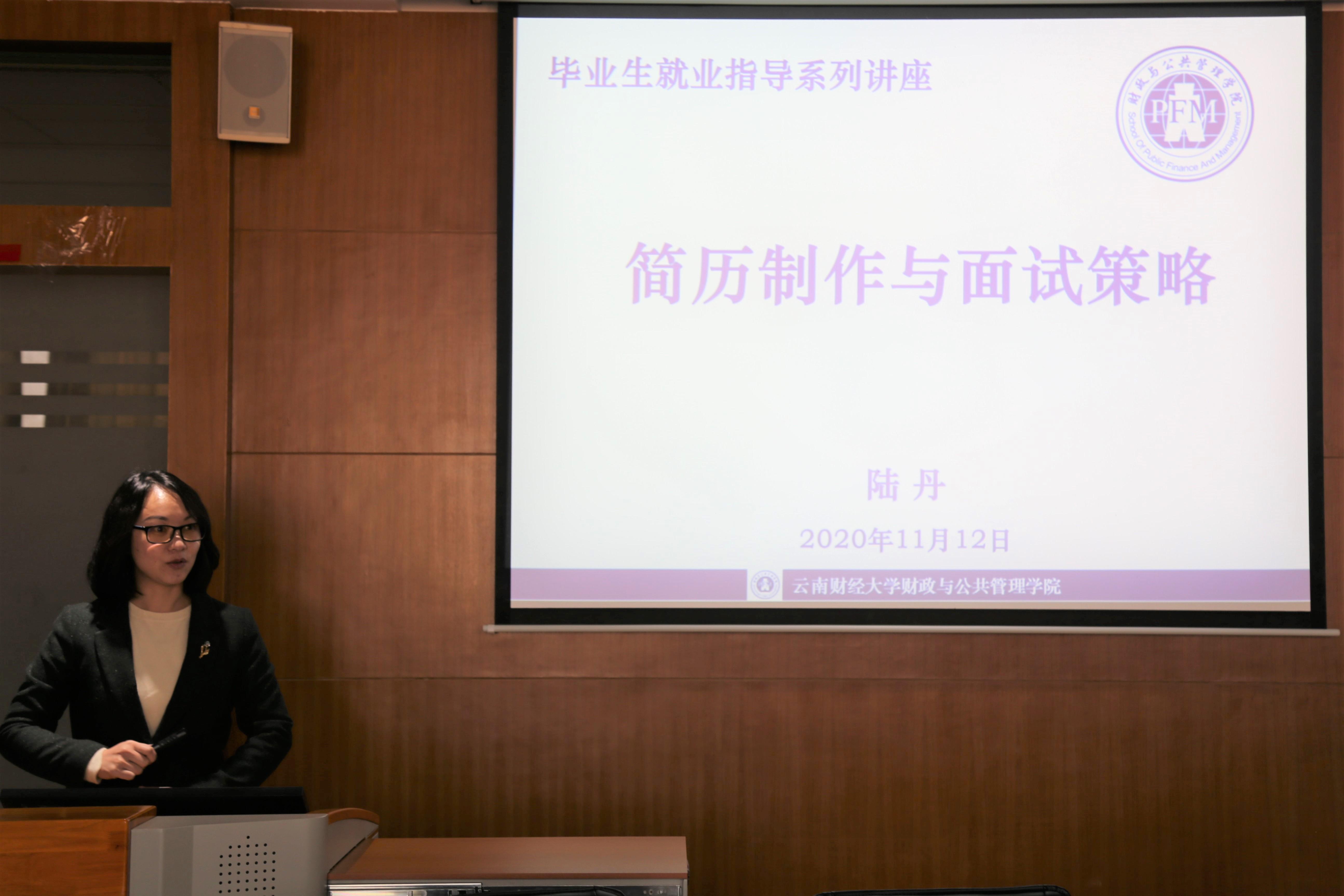 11月12日下午,beat365财政与公共管理学院举办2021届毕业生简历制作和面试指导讲座,讲座采用线上线下相结合的方式开展。学院教师陆丹主讲,学生管理科老师方素祥主持讲座,学生管理科辅导员王淑一及全体2021届毕业生参加讲座。