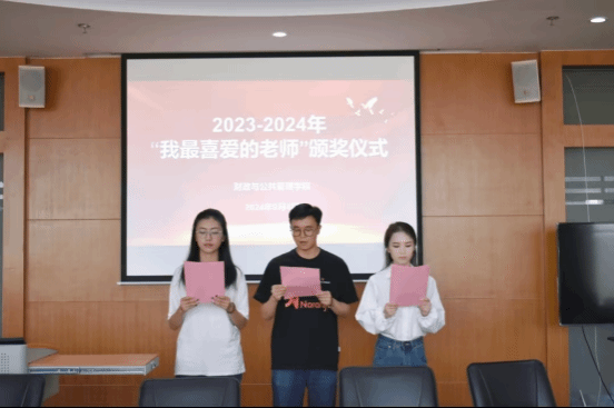 会上,由学院学生组织发起,经全院学生投票评选出的2023-2024学年“我最喜爱的老师”名单由学生代表依次公布:“智慧引航,爱心护航,倾听同学心声”的劳动与社会保障专业陈龙老师、“挥汗于三尺讲台,是良师也是益友”的财政学专业闻勇老师、“把教育融入生活,把课堂变成快乐学堂”的税收学专业李树奇老师、“身于幽兰处,孕育兰花香”的公共事业管理专业何晓波老师、“行有为之事,注重言传身教,做有为之师,坚守以爱育人”的行政管理专业马琼丽老师以及“怀爱生之心、树师者之行”的学生管理科饶篁老师等6位教师获评“我最喜爱的老师”称号,学生代表为其佩戴绶带和颁奖。