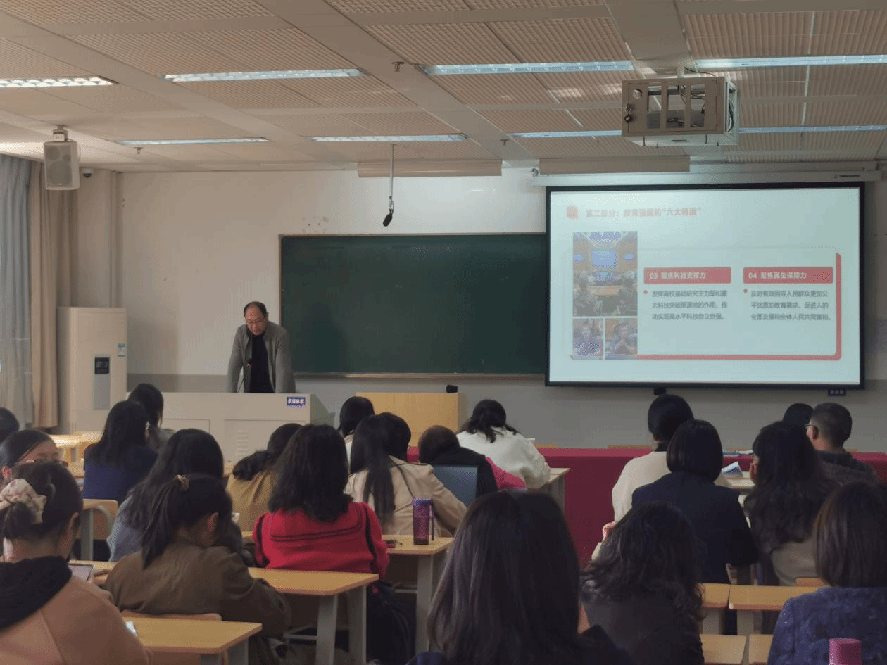 和立道以《深刻理解教育强国建设纲要之“纲”》为题,从教育的“三大属性”、教育强国的“六大特质”和支撑教育强国建设的“八大体系”三个方面详细介绍了《纲要》的主体思路。要求全体教职工把认真学习《纲要》精神与学习贯彻党的二十届三中全会精神和习近平总书记关于教育的重要论述紧密结合起来,以改革创新为动力,坚持立德树人根本任务,不断提升人才培养质量。