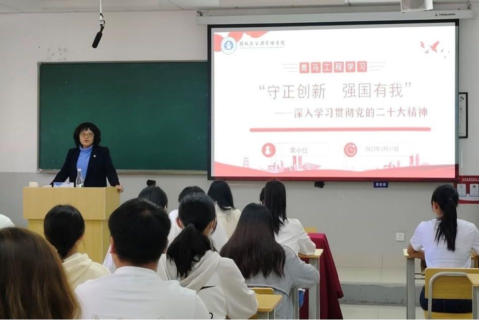 3月17日中午,财政与公共管理学院在南院逸夫楼208举办青马班开班仪式暨第一讲专题学习。学院党委书记荣小红主讲,辅导员王淑一主持,学院青马学员共65人参加了学习。