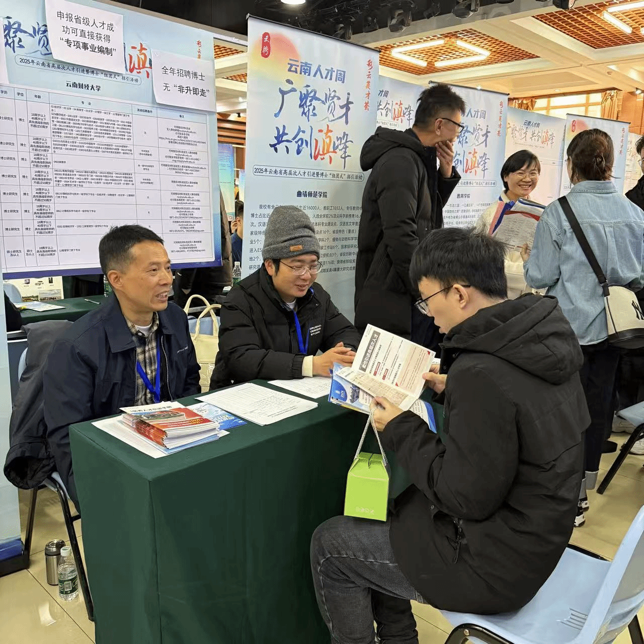 此次引才活动紧扣国家 “十四五”"规划和云南省 “3815”战略发展需求,通过“政策宣讲 + 现场洽谈”双轨模式展开。引才队伍参加了省人力资源和社会保障厅组织的宣讲会,与学生代表进行了密切交流。在招聘活动现场,引才队伍向咨询学生系统阐释了云南省“兴滇英才支持计划”、“云彩学者”青年人才相关政策,详细介绍了青年博士的引进政策和待遇标准。针对博士群体普遍关注的聘期考核、科研成果界定标准等焦点问题,引才队伍详细介绍了包括聘期考核制度在内的人才评价机制,帮助咨询学生充分理解学校提供的包容性成长路线。