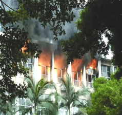 2011年10月10日中午12点40分左右某高校化学化工学院理学楼四楼(学生实验室)发生火灾,且实验室里存放大量的易燃易爆物品。据目击者称事发时是午饭时间,最后一名学生做完实验离开后不久就着火了,可能是这名学生离开时忘记关闭实验设备,导致着火。
