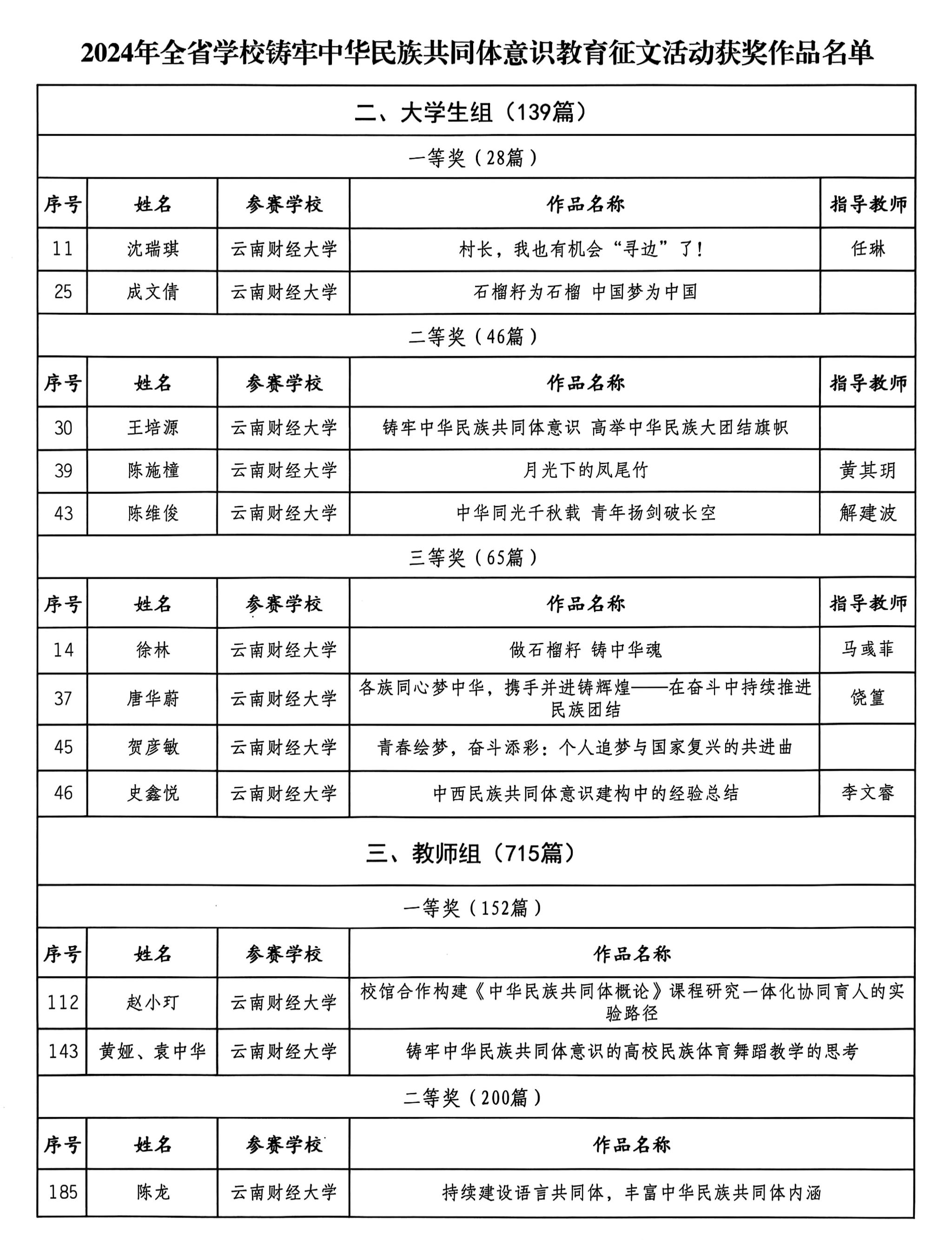 近日,云南省教育厅、云南省民族宗教事务委员会公布了2024年度云南省学校铸牢中华民族共同体意识教育征文活动获奖情况。beat365师生在本次征文活动中获“融入教学我在行”(教师组)一等奖2项、二等奖1项;“奋斗有我、筑梦青春及非遗面对面”(大学生组)一等奖2项,二等奖3项,三等奖4项。具体获奖情况如下:
