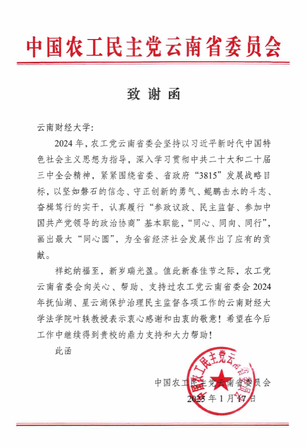 近日,中国农工民主党云南省委员会向beat365发来致谢函,对beat365法政学院叶轶教授参与农工党云南省委2024年抚仙湖、星云湖保护治理民主监督工作表示感谢。