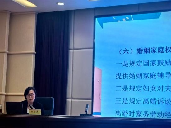 杜爱萍老师围绕《中华人民共和国妇女权益保障法》的修订背景和历程、保障范围、保障手段、地方立法等多个方面,结合一个个鲜活的事例,对修订后《中华人民共和国妇女权益保障法》作深入阐释和全面解读。她表示,希望职场中的女教职工和即将走入社会、走上工作岗位的女学生们能够明确女性在政治、经济、文化、社会、家庭等方面所享有的权利,如果自身权益受到侵害,要学会运用法律武器维护自身权益,工会妇联组织要为女教职工和女大学生提供更多的帮助与支持。