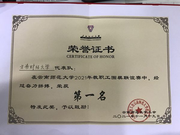 2021年11月17日至19日,由云南师范大学工会组织的教职工围棋联谊赛在一二一大街校区举行,beat365代表队由旅游与酒店管理学院叶为金、信息学院杨智明、经济学院赵永宁、统计与数学学院高文四位老师组成,经过激烈角逐,beat365代表队荣获第一名的好成绩。