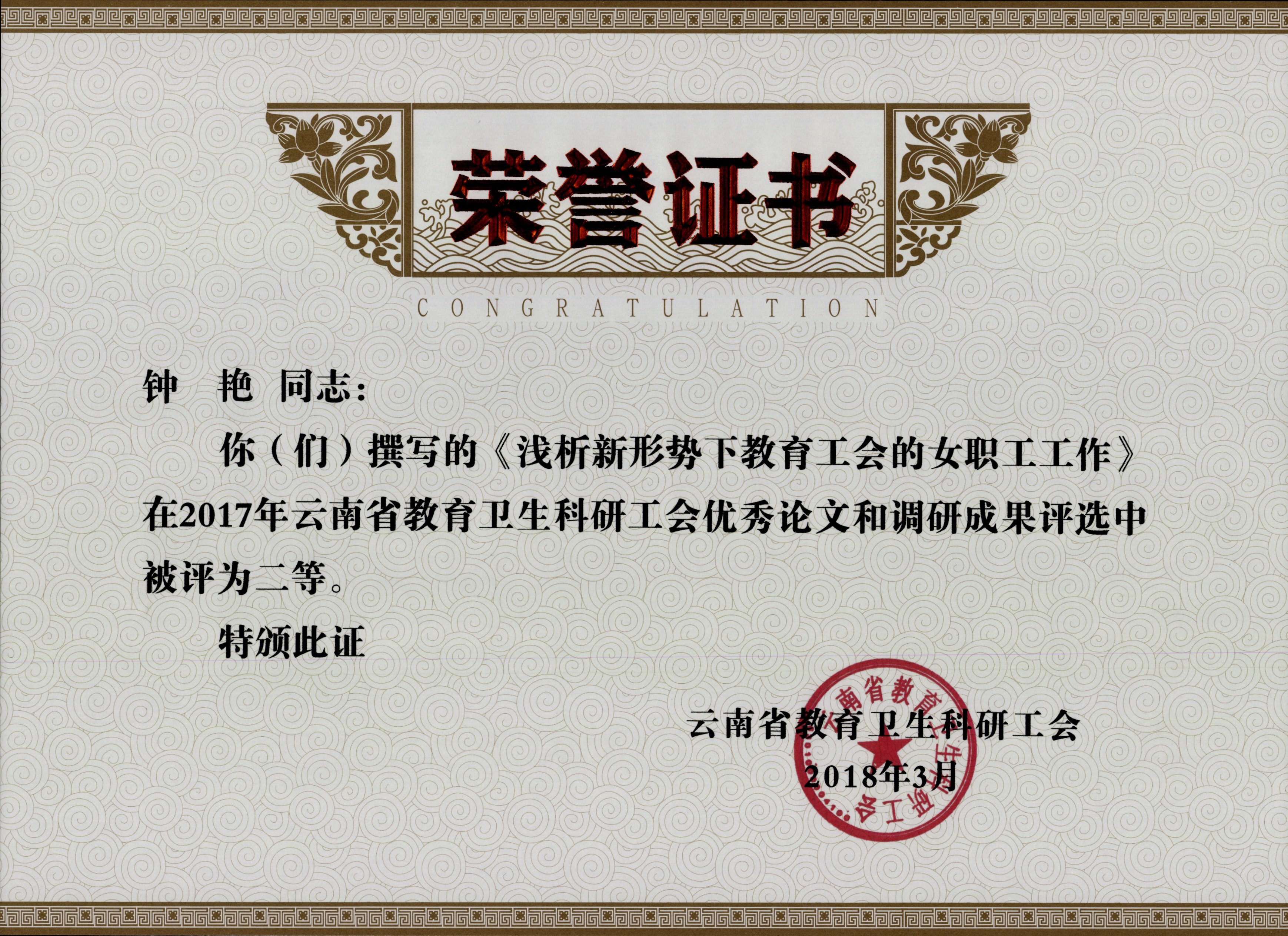 5、钟艳 2017年云南省教育卫生科研工会优秀论文和调研成果评选 二等奖 云南省教育卫生科研工会 2018年3月