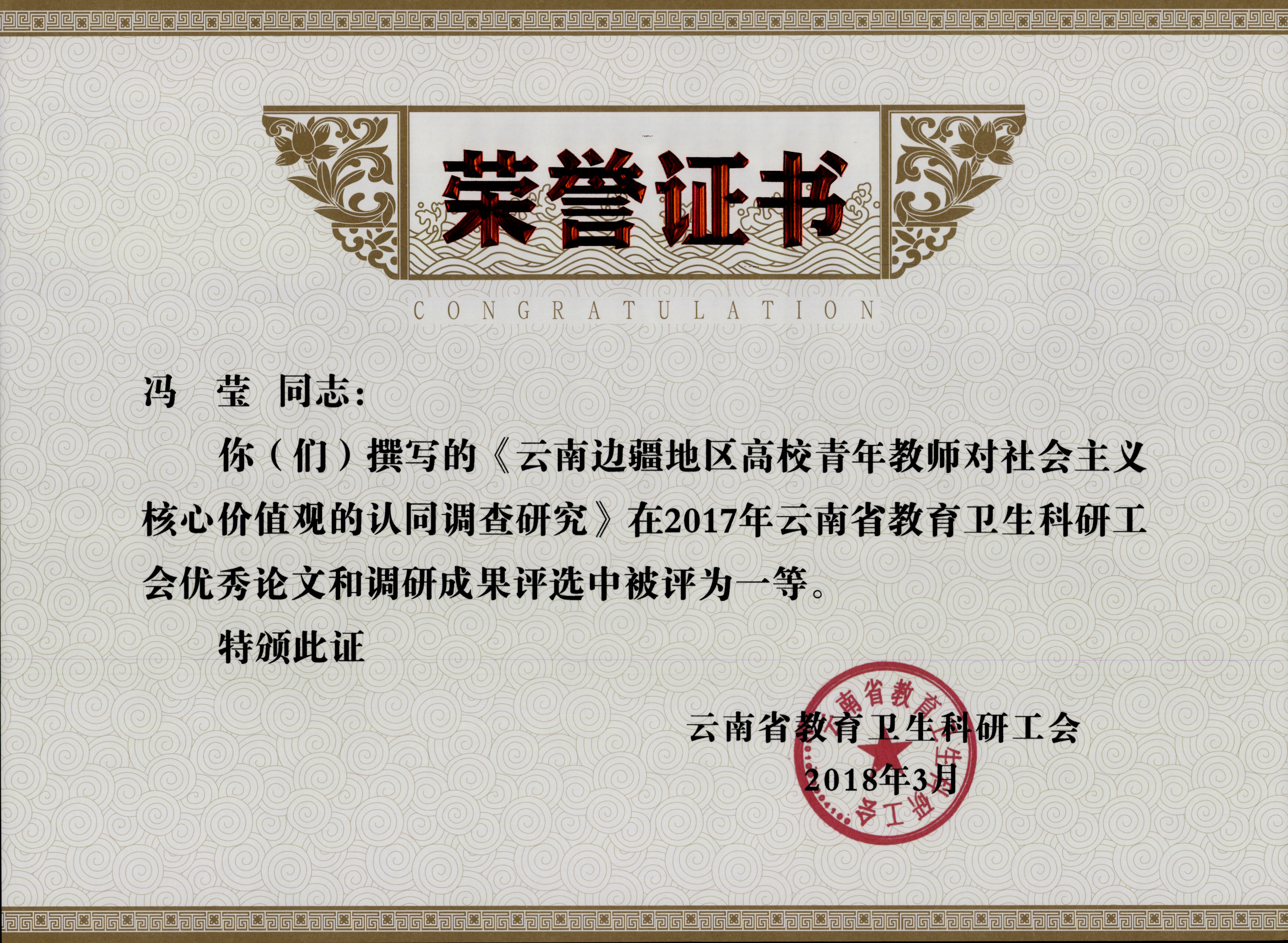 3、冯莹 2017年云南省教育卫生科研工会优秀论文和调研成果评选 一等奖 云南省教育卫生科研工会 2018年3月