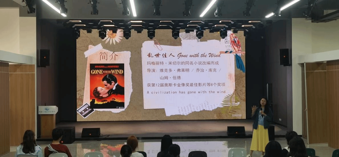 4月18日,近百名学生在秋实楼云彩“一站式”学生中心“大思政·小剧场”观赏经典电影《乱世佳人》。心理教育与咨询中心侯杨杨老师以影片创作及其历史背景为切入点,邀请同学们赏析主角斯嘉丽的成长历程,引导同学们思考坚韧与蜕变是如何在角色中体现的,并进行分享交流。