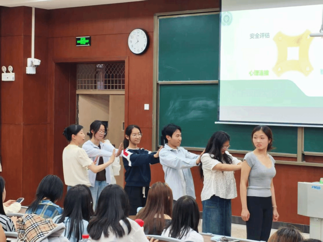 胡怡以真实鲜活的案例为引,借助“三重脑结构理论”,层层剖析情绪危机背后的神经运行机制,将复杂的神经科学知识转化为通俗易懂的内容。她还积极与学生互动,邀请心理委员走上讲台,开展模拟场景互动。在生动有趣的实践中,心理委员们亲身体验了如何将理论知识运用到实际沟通场景中,实现学以致用。