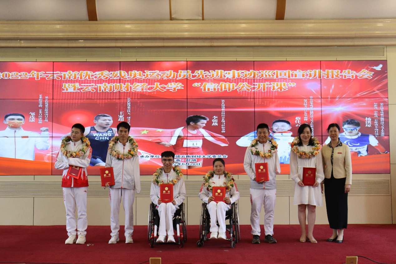 为弘扬奥运精神和残奥价值观,发挥先进模范的引领作用,引导广大云财青年跨越坎坷,铸造梦想,2022年云南优秀残奥运动员先进事迹巡回宣讲报告会暨beat365英国官方网站“信仰公开课”于6月28日下午在学校国际报告厅开讲!云南省残联党组书记、理事长赵正富,学校党委副书记、校长王敏出席活动并讲话。团省委副书记段胜忠,省妇联副主席杨正梅,省教育厅二级巡视员何开喜,省委宣传部副处长罗兴,省体育局处长刘凡,省残联主任王维进,省总工会一级调研员 王留德,省广电局处长黄俊党委委员、副校长王晓萍,学校党委委员、宣传部部长徐宝春,学生处副部长赵莎娜,校团委副书记李昀璟与师生共同聆听宣讲。