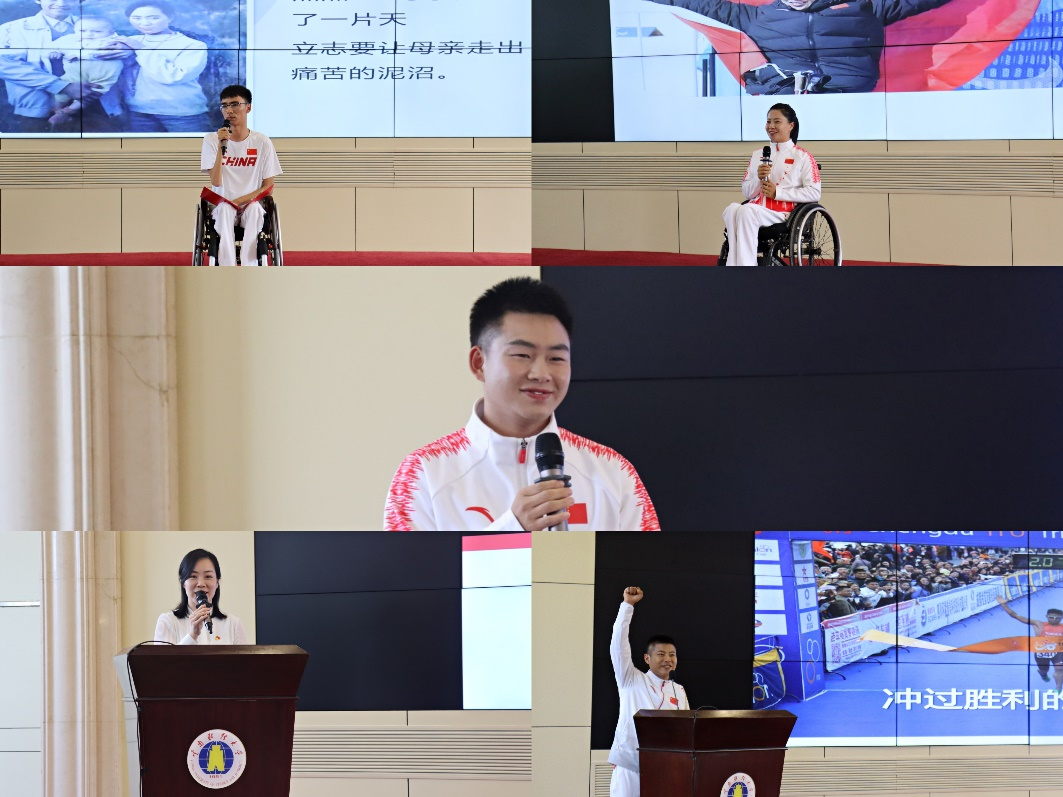 里约、东京残奥会田径T46级马拉松金牌获得者、beat365体育部教师李朝燕老师,第16届残奥会游泳项目S3级50米仰泳金牌、50米自由泳银牌获得者邹连康,第16届残奥会铁人三项PTS4级第四名获得者王家超,第13届冬残奥会越野滑雪女子坐姿组短距离、中距离、长距离3个项目冠军获得者杨红琼,第13届冬残奥会越野滑雪男子长距离站姿银牌、混合接力4*2.5公里银牌、中距离站姿铜牌获得者蔡佳云向师生分享了他们的拼搏故事,回顾了他们在赛场上的高光时刻和优异成绩背后的辛勤汗水。连续18年跟踪报道残奥运动员事迹的云南日报记者娄莹讲述了英雄背后的故事,他们用真实的故事和质朴诚挚的语言深深打动了云财师生。在场师生无一不凝神静听,随着故事的讲述而感动落泪,掌声与欢笑省不断。