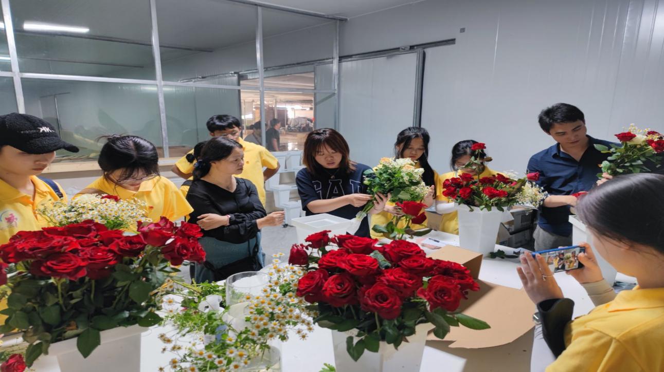 7月16日商学院暑期“三下乡”调研二队赴晋宁区花卉企业开展乡村振兴调研活动。晋宁区相关领导支持,王敏书记等8名教师带队调研。上午,调研团进入云天化全自动化光伏花卉智能温室大棚,见证了各种云南特色新品玫瑰的种植,同时了解到玫瑰压枝法的原理以及云南省高科技花卉基地“科研+种植+水肥+采后处理+品牌流通+销售”的花卉全产业链。下午,玉莲花卉合作社负责人周毅莲带领团队参观鲜切花加工厂,调研队就乡村振兴下合作社的发展进行访谈,深入了解晋宁花卉产业在乡村振兴推动下的发展状况,并在专业人员的指导下完成了各类花束的搭配、鲜花的保鲜、打包等工作。