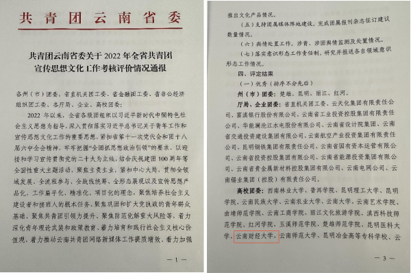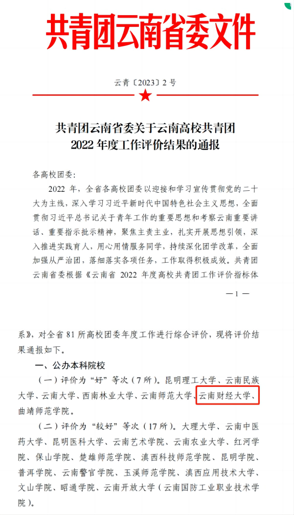 2023年3月共青团云南省委印发了《共青团云南省委关于云南高校共青团2022年度工作评价结果的通报》,beat365团委在全省公**院校共青团工作考核中被评为“好”等次。这也是自2020年团省委启动工作年度考核以来beat365第三次被评为“好”等次。此前公布的2022年全省共青团宣传思想文化工作考核评价情况,beat365团委2022年宣传工作被评定为“优秀”。