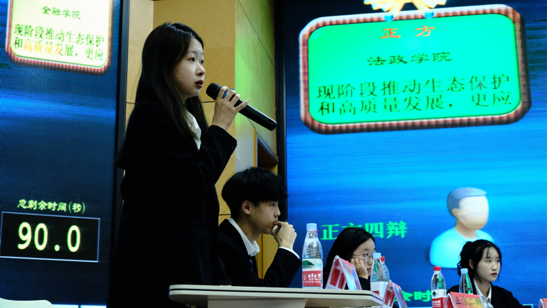 本次思辩·青春辩论赛决赛的第一场是季军争夺站,来自法政学院与金融学院选手就“现阶段推动生态保护和高质量发展,更应注意产业转型/人才引进”主题展开辩论,双方在辩论中唇枪舌战,据理力争,虽辩论激烈但不失学子礼节。